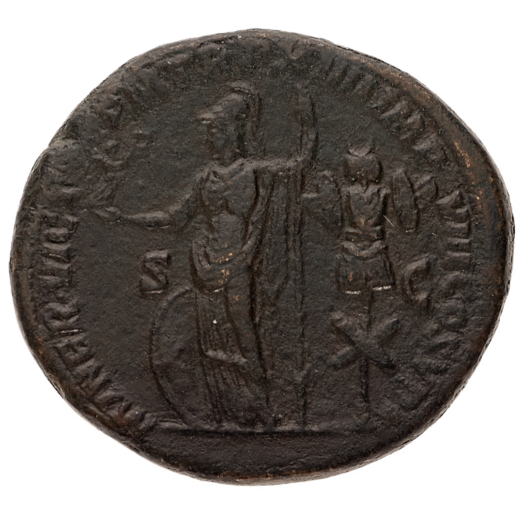 Sesterzio databile al 189 d.C. - Zecca: Roma - Diritto: testa laureata dell'Imperatore a destra - Rovescio: Minerva stante a sinistra, tiene una Vittoria con la mano destra e una lancia con la sinistra; nel campo a destra un trofeo d'armi - gr. 25,89 - BB