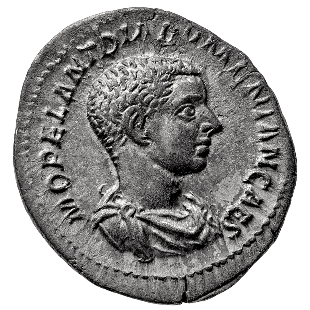 Denario con il titolo di Cesare databile agli anni 217-218 d.C. - Zecca: Roma - Diritto: busto drappeggiato e corazzato di Diadumeniano a destra - Rovescio: Diadumeniano stante di fronte con il volto a destra tiene uno stendardo con la mano destra e uno scettro con la sinistra; alla sua sinistra due stendardi - gr. 2,94 - Non comune - Lievi depositi al rovescio, comunque SPL - Corredata dal cartellino di Oscar Rinaldi