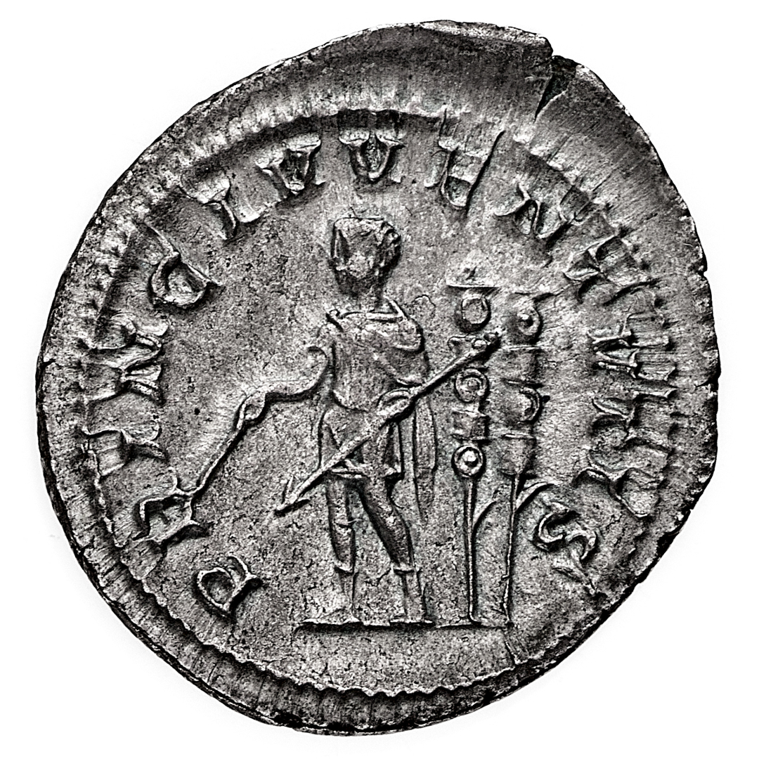 Denario al nome e con l'effigie di Massimo Cesare, figlio dell'Imperatore, databile agli anni 236-238 d.C. - Zecca: Roma - Diritto: busto drappeggiato di Massimo Cesare a destra - Rovescio: Massimo Cesare stante a sinistra tiene una bacchetta con la mano destra e una lancia con la sinistra; alla sua destra due stendardi - gr. 3,49 - SPL