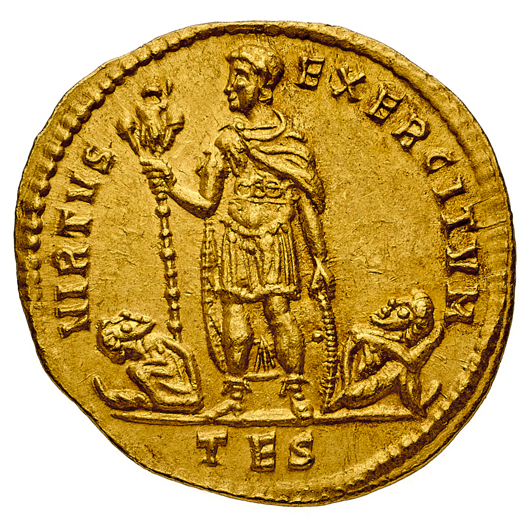 Solido databile al periodo 337-340 d.C. - Zecca: Tessalonica - Diritto: busto diademato di perle, drappeggiato e corazzato dell'Imperatore a destra - Rovescio: l'Imperatore in abiti militari stante a sinistra tiene un trofeo con la mano destra e posa la sinistra su uno scudo; ai lati due prigionieri seduti - gr. 4,53 - Rara - Splendida patina, q.FDC