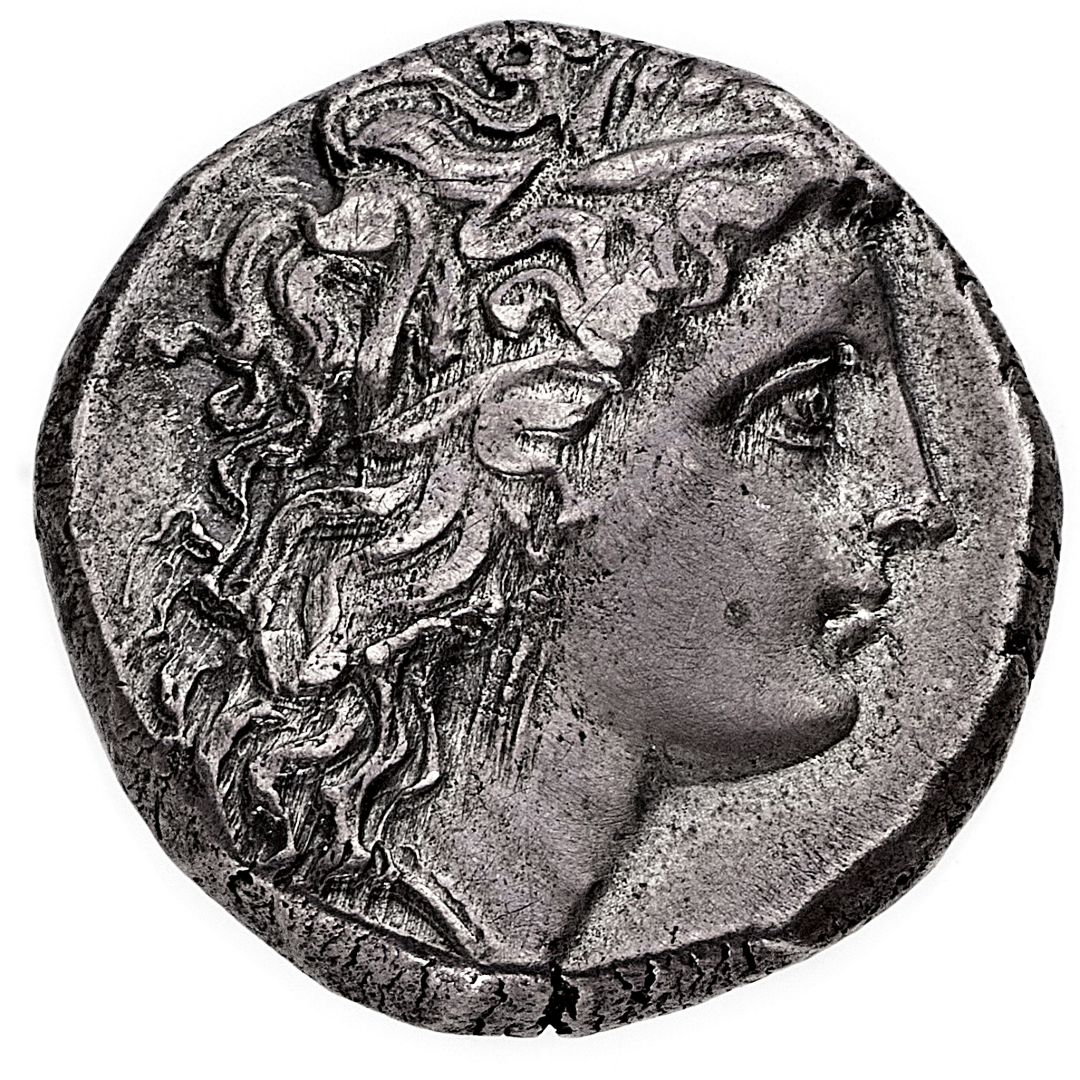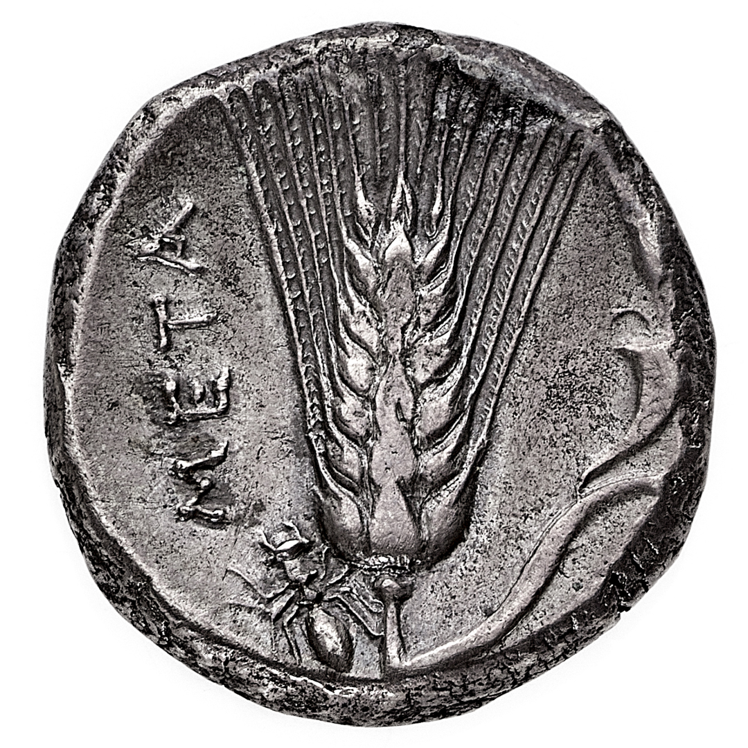 Metaponto - Statere databile al periodo 290-280 a.C. - Diritto: testa di Demetra coronata di spighe a destra - Rovescio: spiga di grano disposta verticalmente; sopra la foglia, a destra, una cornucopia; in basso a sinistra una formica - gr. 7,70 - Patina di medagliere, q.SPL