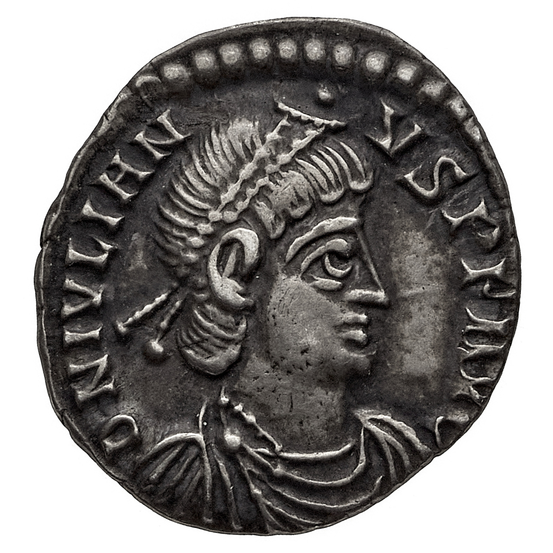 Siliqua databile agli anni 360-363 d.C. - Zecca: Arles - Diritto: busto giovanile drappeggiato e corazzato dell'Imperatore a destra - Rovescio: legenda su quattro righe all'interno di una corona di quercia - gr. 1,98 - Patina di medagliere, q.SPL