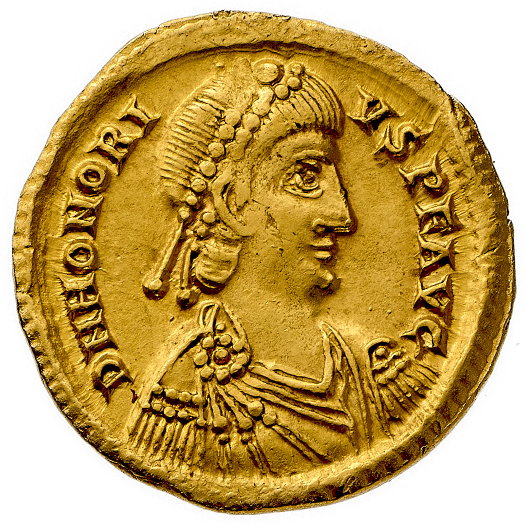 Solido databile al periodo 402-406 d.C. - Zecca: Ravenna - Diritto: busto diademato di perle, drappeggiato e corazzato dell'Imperatore a destra - Rovescio: l'Imperatore stante a destra, tiene uno stendardo con la mano destra e un globo niceforo con la sinistra; con il piede sinistro schiaccia un prigioniero a terra - gr. 4,49 - SPL