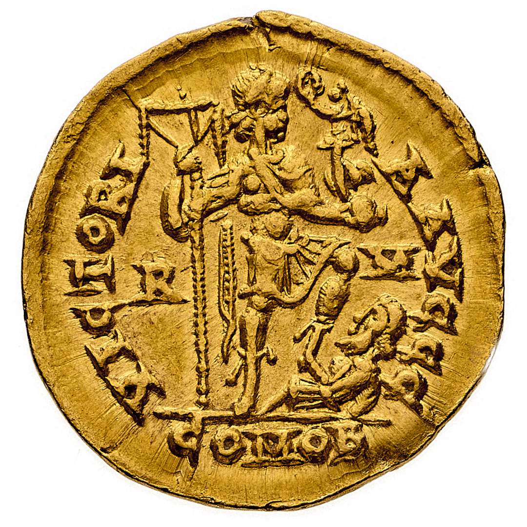 Solido databile al periodo 404-408 d.C. - Zecca: Roma - Diritto: busto diademato di perle, drappeggiato e corazzato dell'Imperatore a destra - Rovescio: l'Imperatore stante a destra tiene uno stendardo con la mano destra e un globo niceforo con la sinistra; con il piede sinistro schiaccia un prigioniero a terra - gr. 4,48 - Fondi lucenti, migliore di SPL