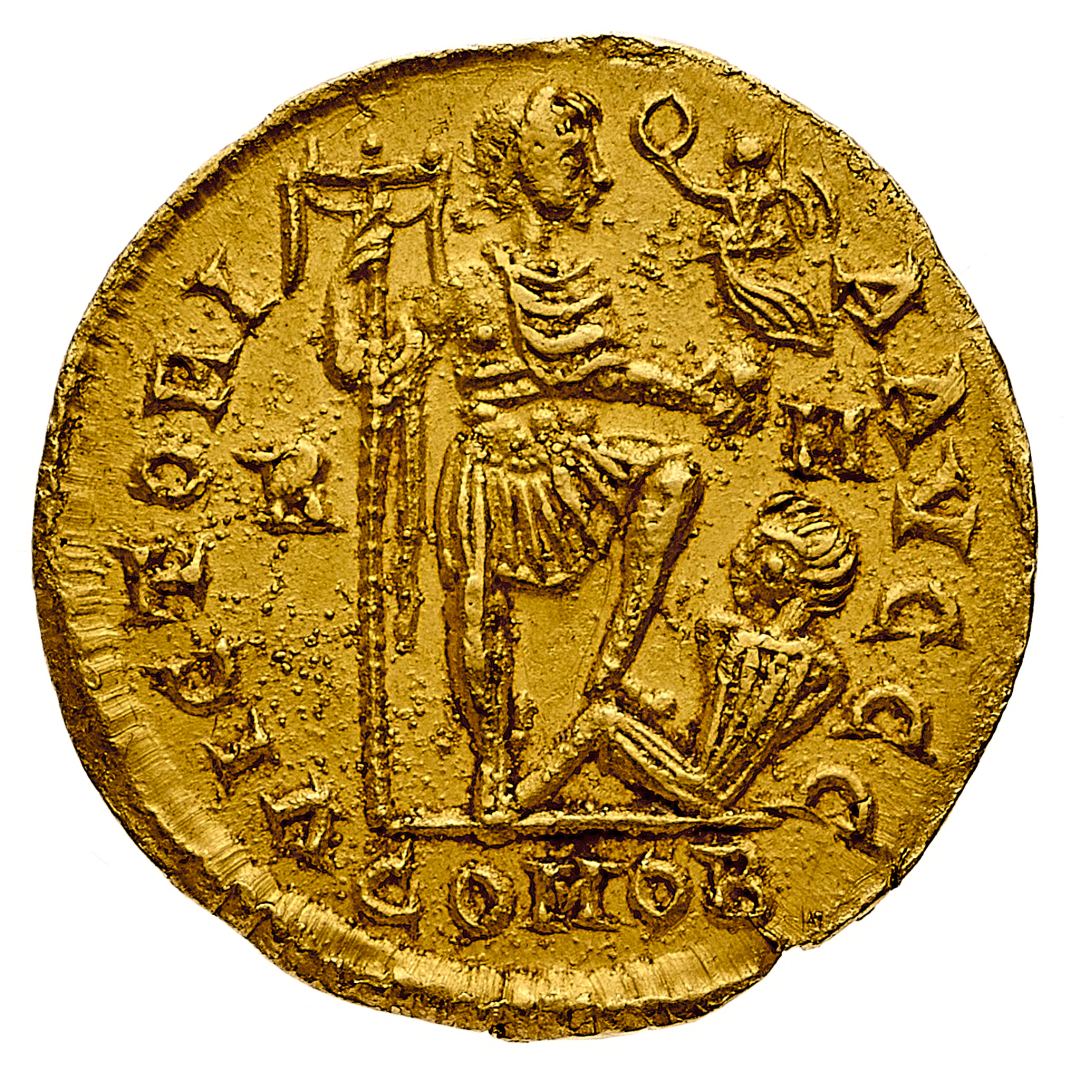 Solido databile al periodo 404-408 d.C. - Zecca: Roma - Diritto: busto diademato di perle, drappeggiato e corazzato dell'Imperatore a destra - Rovescio: l'Imperatore stante a destra, tiene uno stendardo con la mano destra e un globo niceforo con la sinistra; con il piede sinistro schiaccia un prigioniero a terra - gr. 4,21 - Lievi debolezze di conio al rovescio, q.SPL