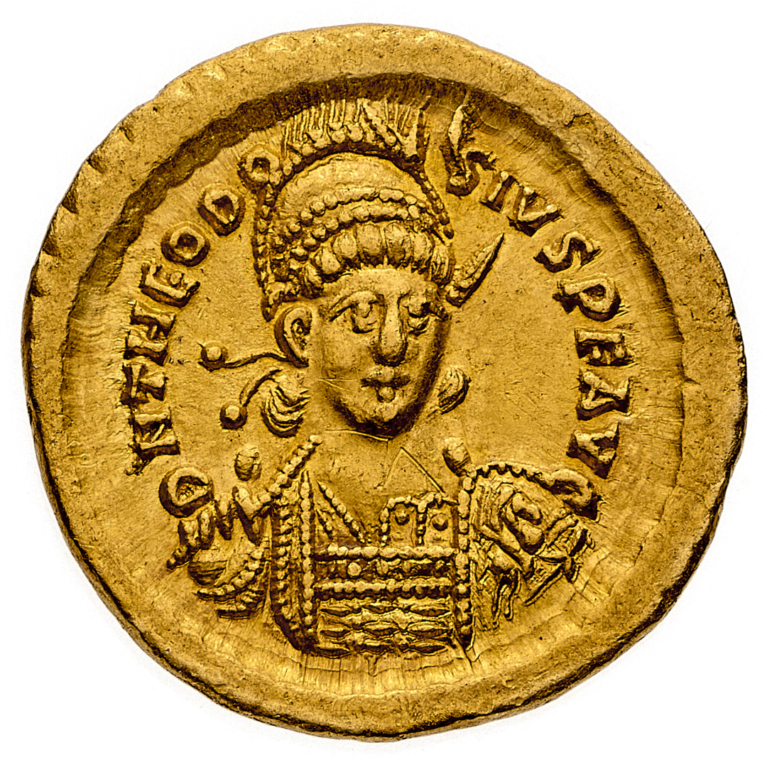Solido databile al periodo 430-440 d.C. - Zecca: Costantinopoli - Diritto: mezzo busto elmato e diademato dell'Imperatore di fronte, nella mano destra tiene una lancia appoggiata alla spalla - Rovescio: Costantinopoli seduta a sinistra tiene un globo crucigero con la mano destra e un lungo scettro con la sinistra; nel campo a destra una stella - gr. 4,48 - Non comune - SPL