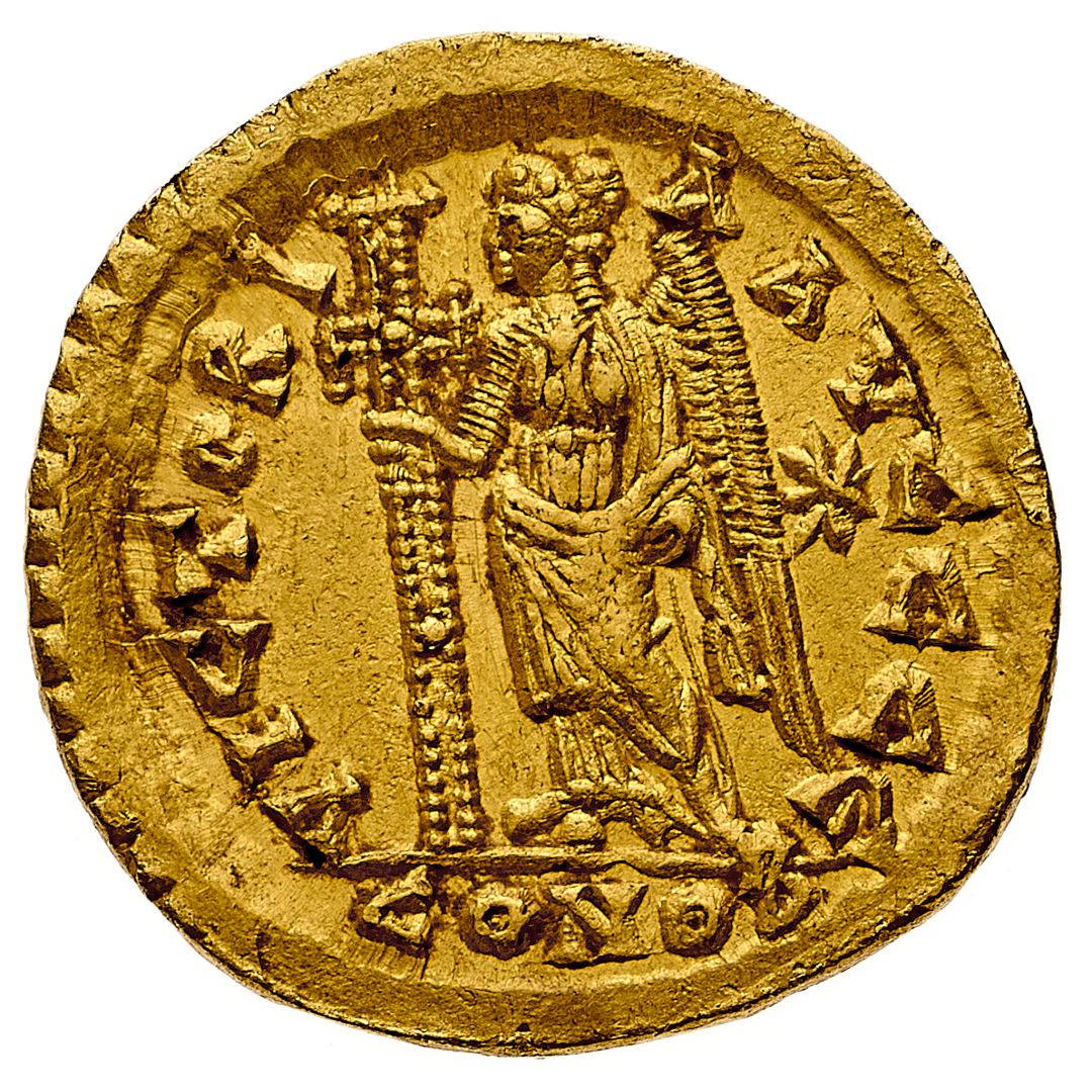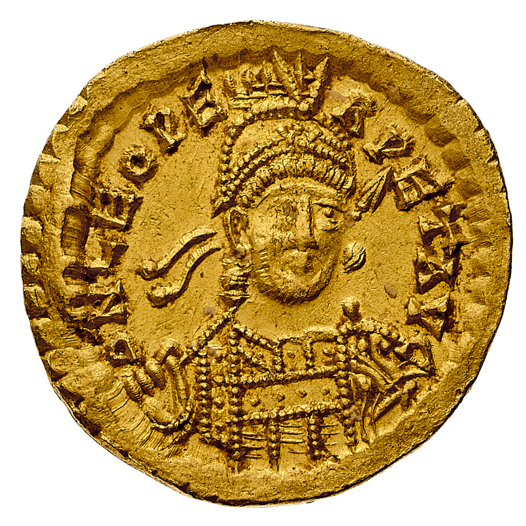 Solido databile al periodo 462-466 d.C. - Zecca: Costantinopoli - Diritto: mezzo busto elmato e diademato dell'Imperatore di fronte - Rovescio: la Vittoria stante a sinistra tiene una lunga croce ingioiellata con la mano destra; nel campo a destra una stella - gr. 4,46 - Fondi ancora parzialmente lucenti, SPL