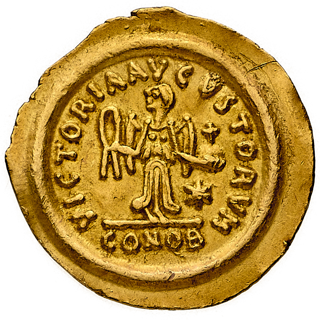 Giustino II (565-578) - Tremisse - Zecca: Ravenna - Diritto: busto diademato, drappeggiato e corazzato dell'Imperatore a destra - Rovescio: la Vittoria andante a destra con il capo rivolto a sinistra, tiene una corona di alloro con la mano destra e un globo crucigero con la sinistra - gr. 1,46 - Lieve colpetto al diritto, q.SPL