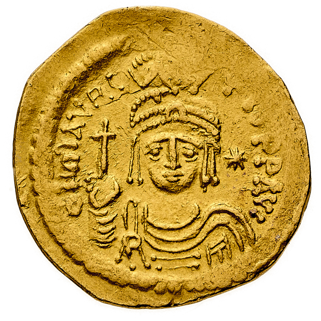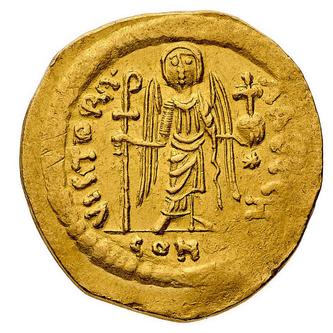 Maurizio Tiberio (582-602) - Solido databile al periodo 583-601 - Zecca: Costantinopoli - Diritto: busto elmato e diademato dell'Imperatore di fronte con il globo crucigero nella mano destra - Rovescio: un angelo stante di fronte tiene un'asta culminante con il monogramma di Cristo con la mano destra e un globo crucigero con la sinistra; sulla destra, nel campo, una stella - gr. 4,07 - Lievi debolezze di conio, SPL