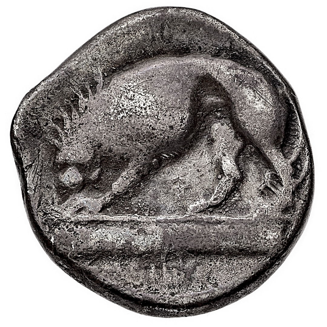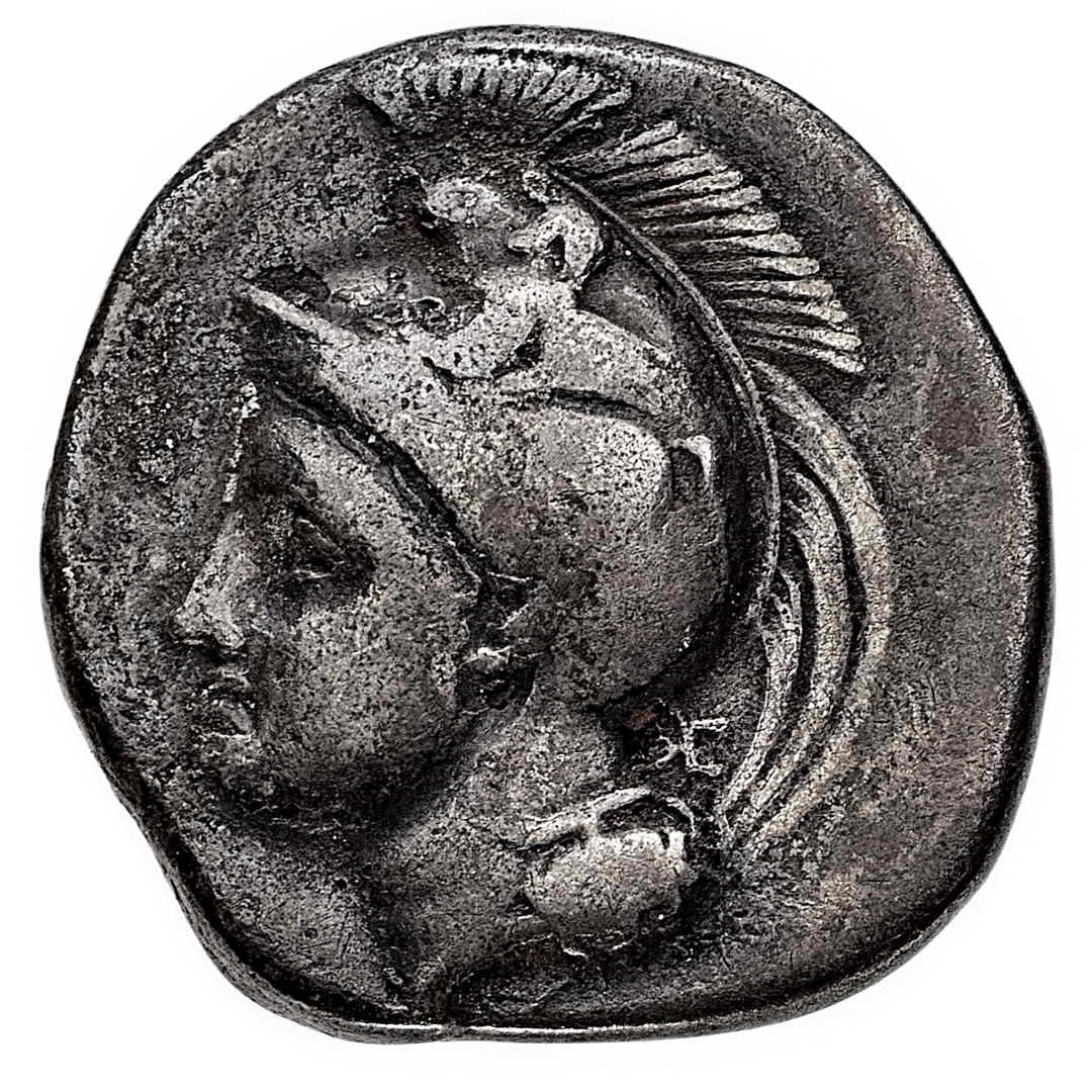 Velia - Didramma databile al periodo 350-310 a.C. - Diritto: testa di Atena a sinistra con elmo attico crestato e ornato da una sfinge - Rovescio: leone a sinistra nell'atto di divorare una preda - gr. 7,19 - Patina di medagliere, BB