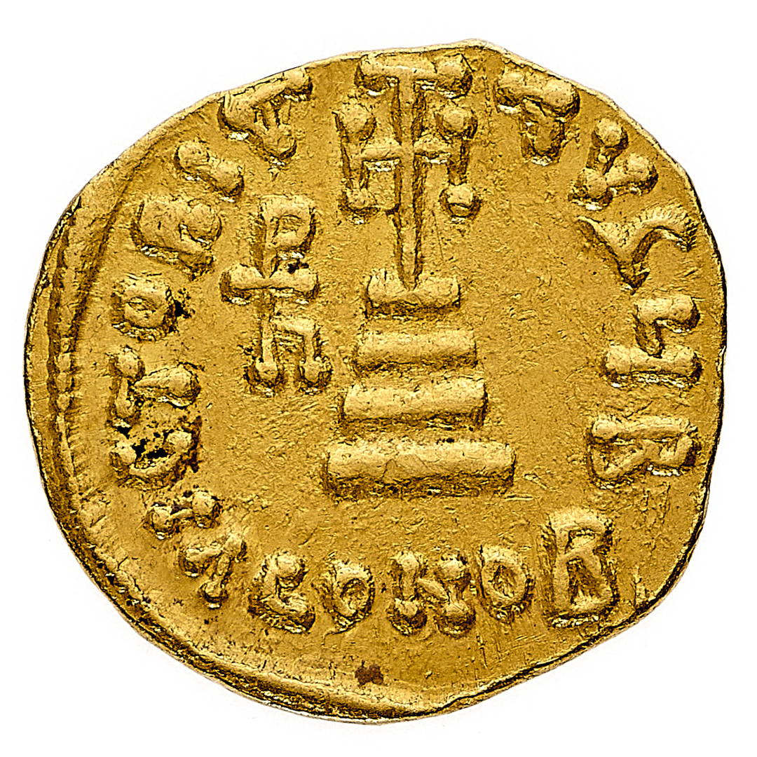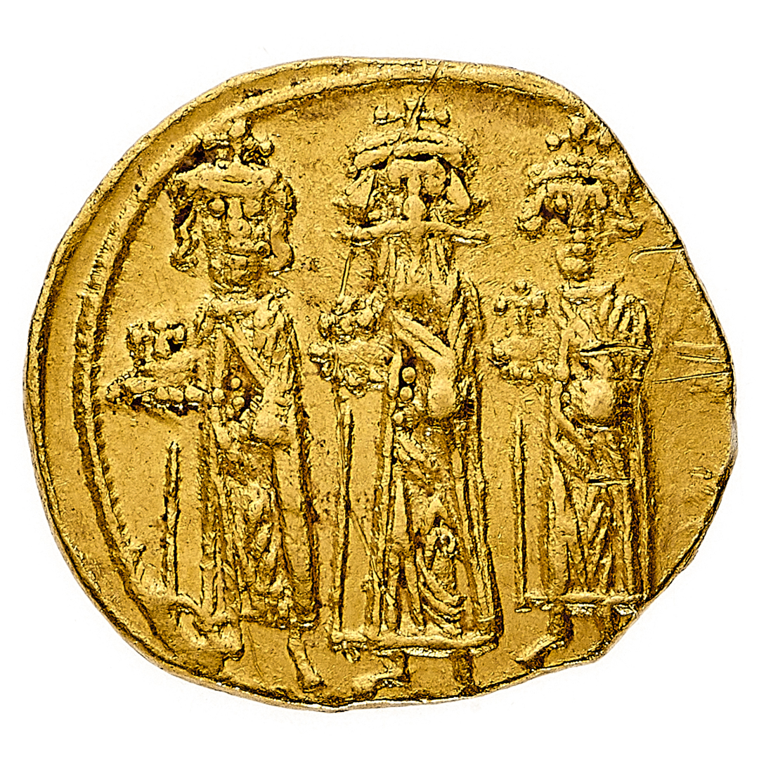 Eraclio (610-641) - Solido databile al periodo 639-641 - Zecca: Costantinopoli - Diritto: l'Imperatore stante di fronte con ai lati i figli Eraclio Costnatino e Eracleona, tutti con il globo crucigero nella mano destra - Rovescio: croce potenziata su un basamento di tre gradini; nel campo a sinistra un monogramma - gr. 4,46 - BB