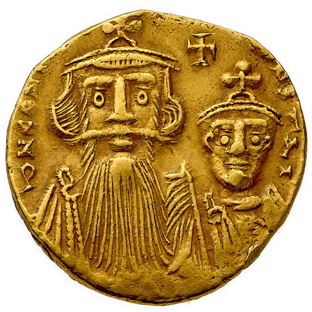 Costante II (641-668) - Solido databile al periodo 654-659 - Zecca: Costantinopoli - Diritto: mezzi busti affiancati dell'Imperatore e del figlio, Costantino IV - Rovescio: croce potenziata su un basamento di tre gradini - gr. 4,34 - Probabili tracce di montatura, BB