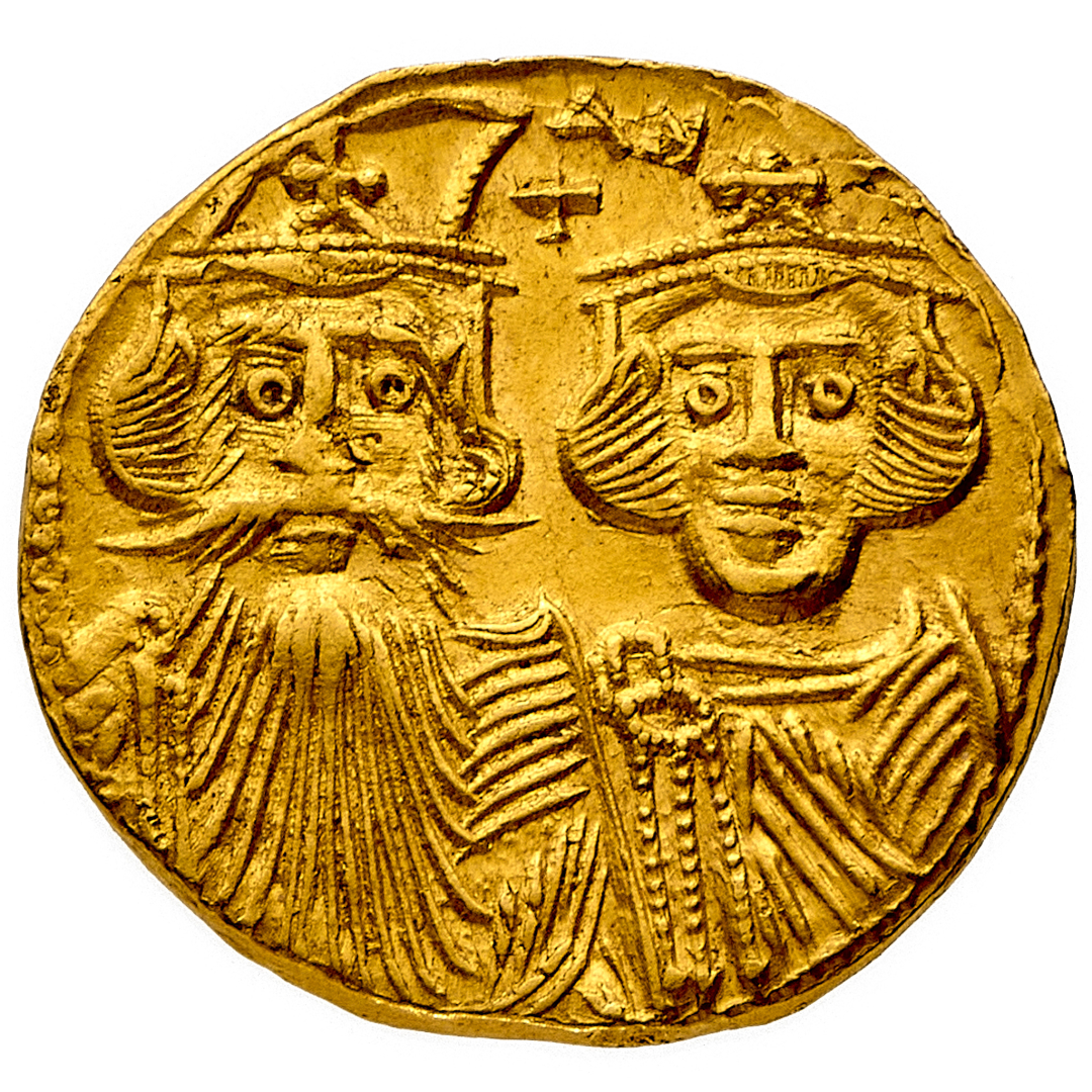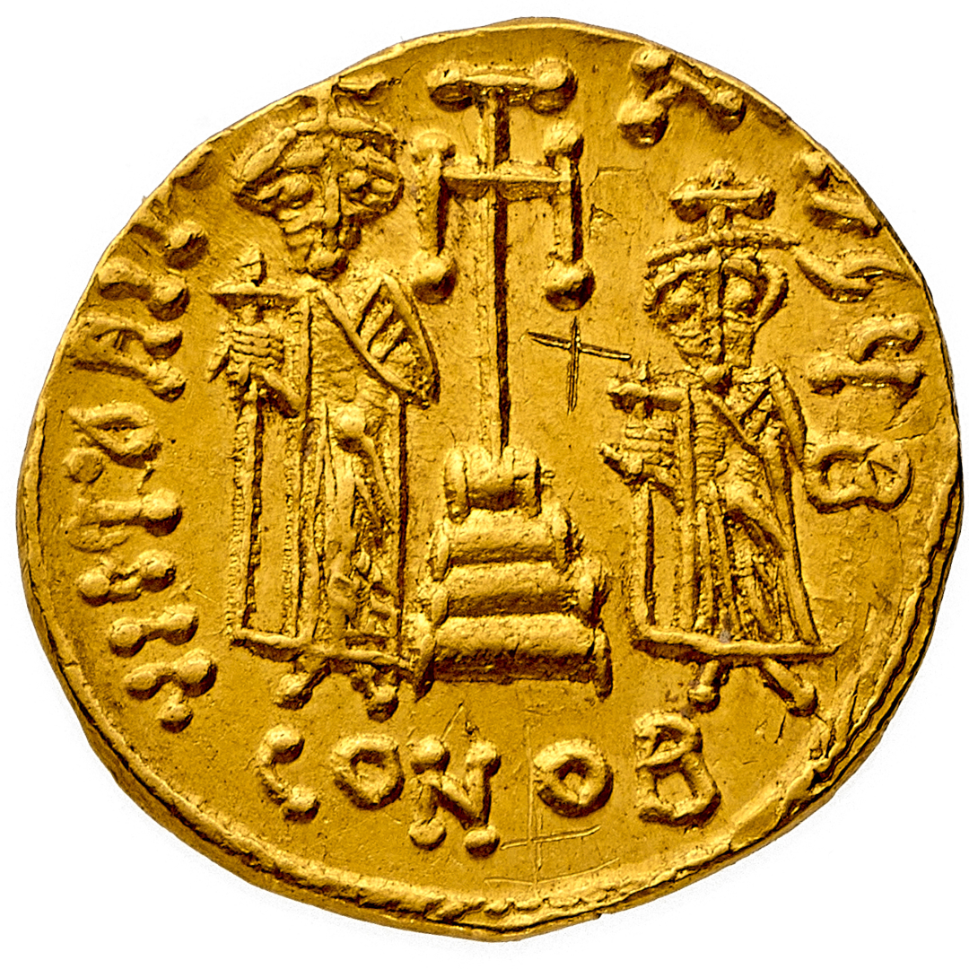 Costante II (641-668) - Solido databile al periodo 661-663 - Zecca: Costantinopoli - Diritto: mezzi busti affiancati dell'Imperatore e del figlio, Costantino IV - Rovescio: croce potenziata su un basamento di tre gradini fra le figure di Eraclio e Tiberio - gr. 4,38 - Graffiti al rovescio, altrimenti migliore di SPL