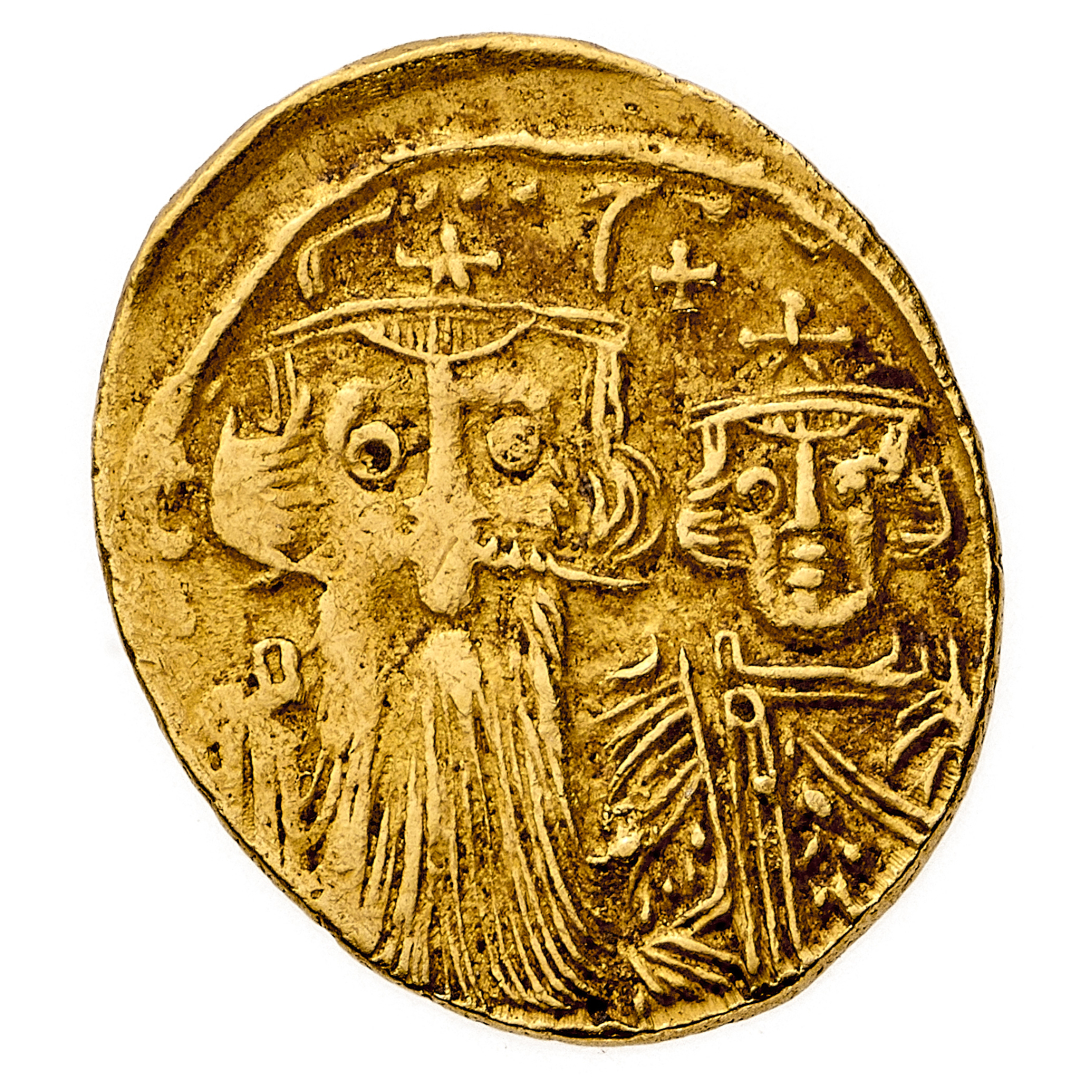 Costante II (641-668) - Solido databile al periodo 661-663 - Zecca: Costantinopoli - Diritto: mezzi busti affiancati dell'Imperatore e del figlio, Costantino IV - Rovescio: croce potenziata su un basamento di tre gradini fra le figure di Eraclio e Tiberio - gr. 4,45 - BB