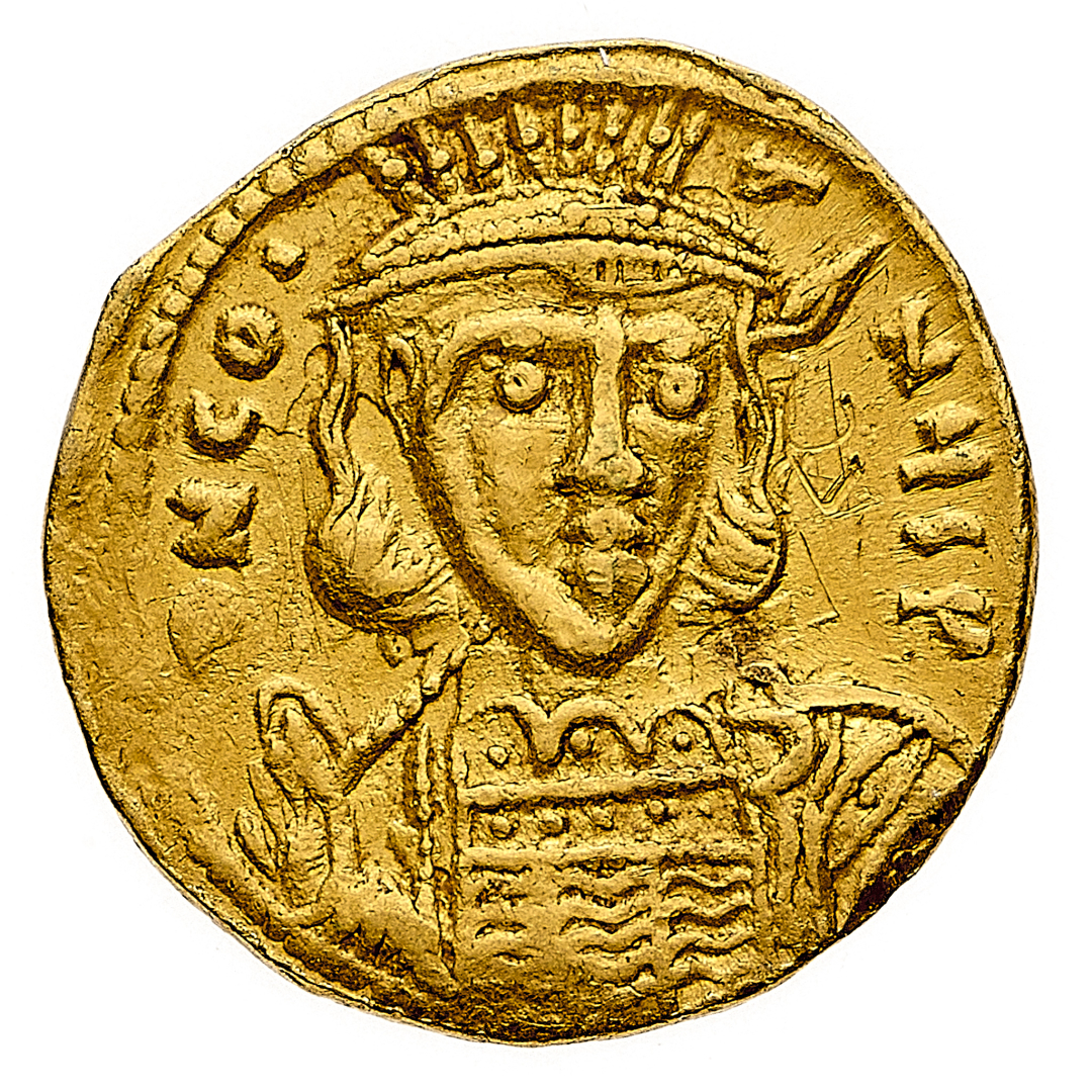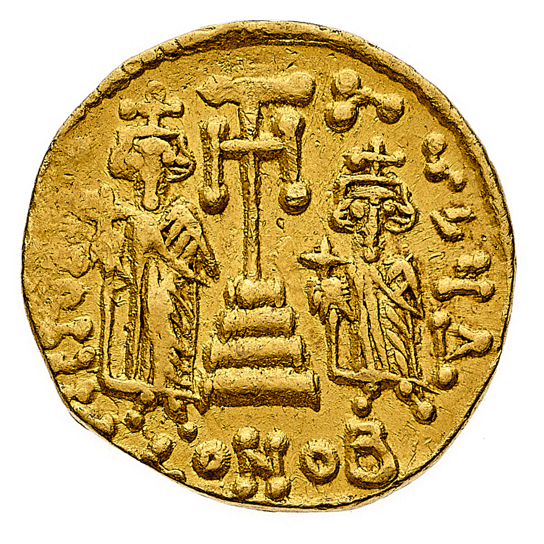 Costantino IV (668-685) - Solido databile al periodo 674-681 - Zecca: Costantinopoli - Diritto: busto coronato e corazzato dell'Imperatore di fronte - Rovescio: Eraclio e Tiberio, fratelli dell'Imperatore, stanti di fronte; fra loro una croce potenziata su un basamento di tre gradini - BB