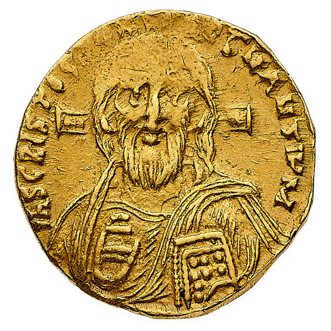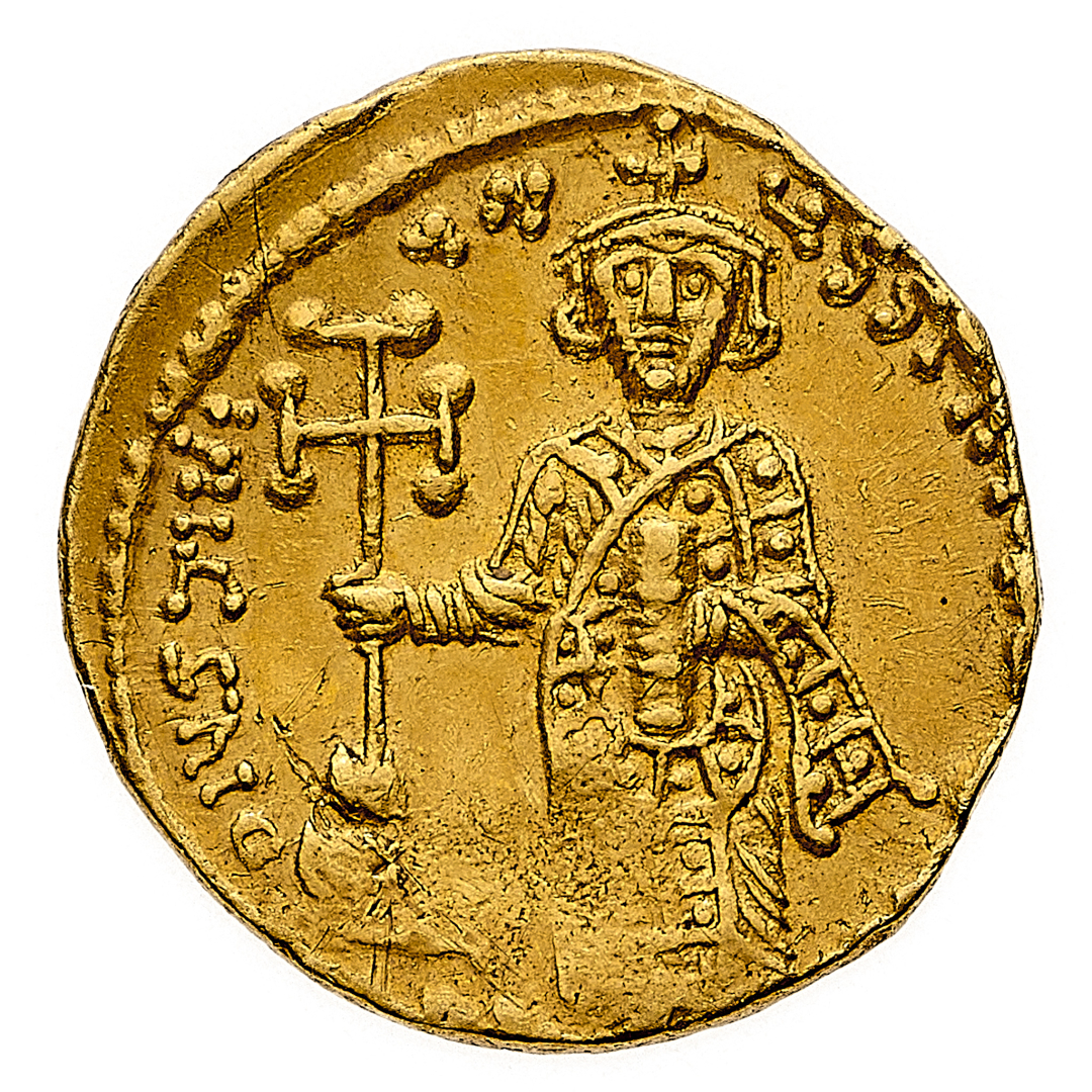 Giustiniano II (Primo Regno 685-695 ) - Solido databile al periodo 692-695 - Zecca: Costantinopoli - Diritto: busto nimbato del Cristo "Pantocrator" di fronte nell'atto di benedire - Rovescio: Giustiniano stante di fronte, tiene con la mano destra una croce potenziata - gr. 4,42 - Rara - Migliore di BB