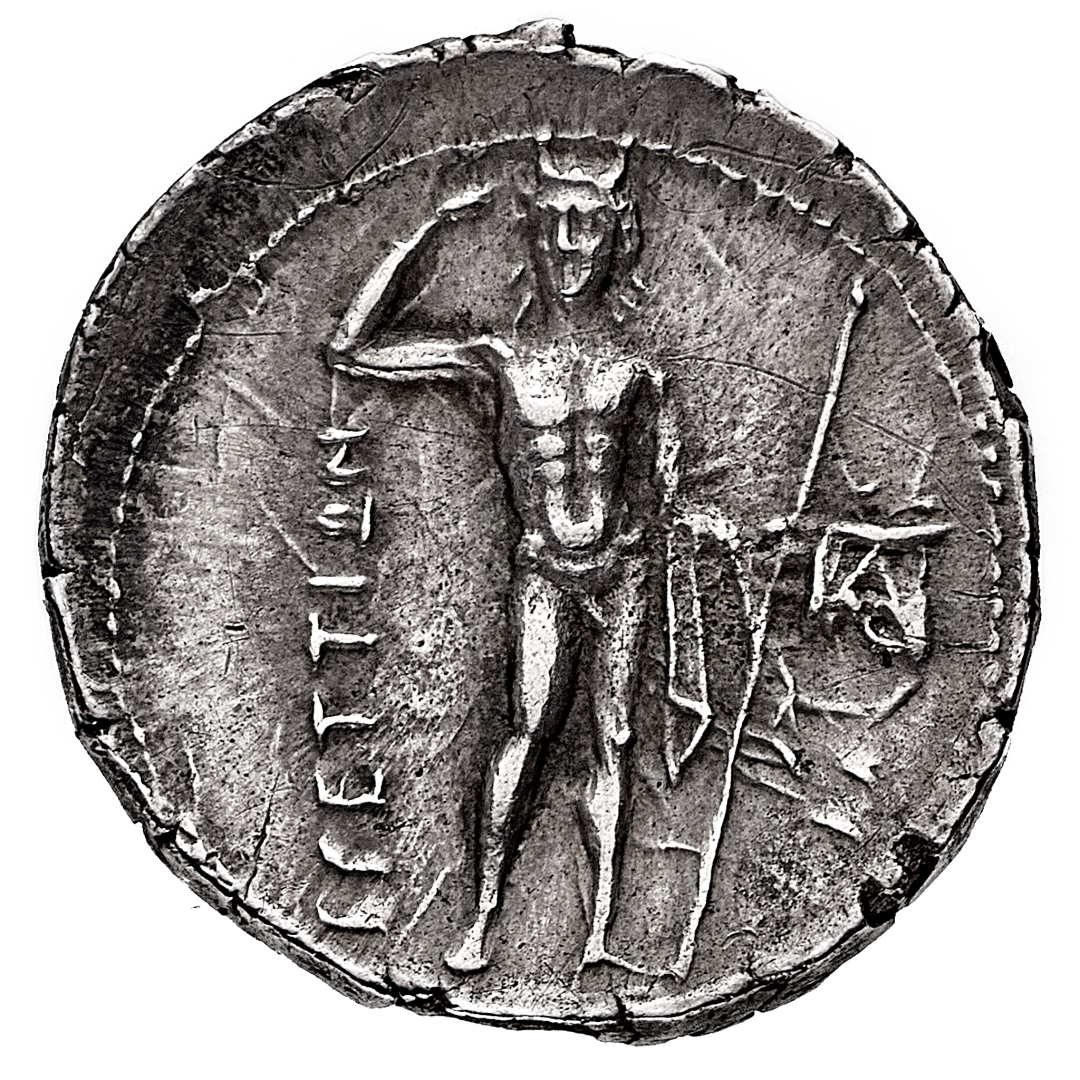 Lega dei Brettii - Dracma databile al periodo 282-203 a.C. - Diritto: testa di Nike a destra; a sinistra, nel campo, un pentagramma - Rovescio: divinità stante di fronte si incorona con la mano destra e tiene uno scettro con la sinistra - gr. 4,45 - SPL