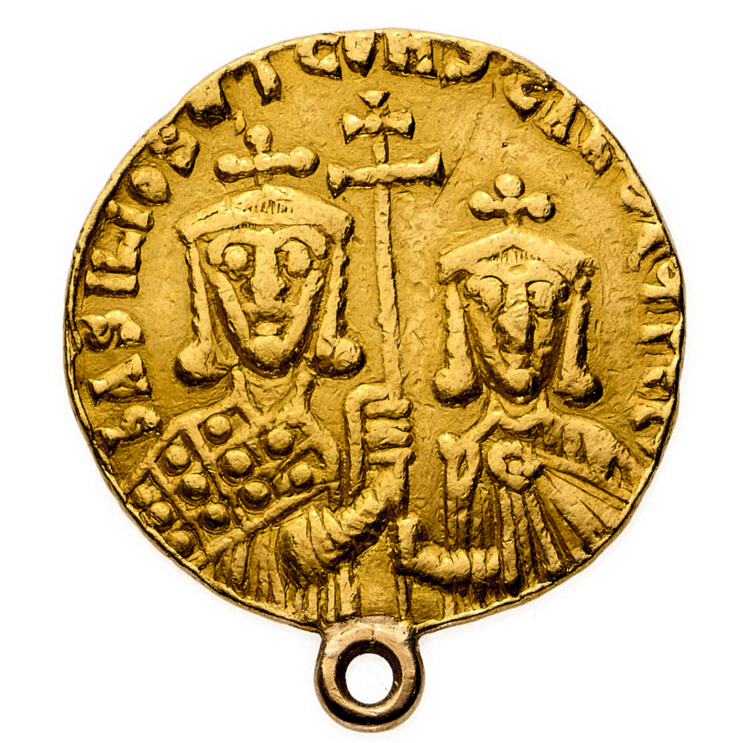 Basilio I (867-886) - Solido databile al periodo 868-879 - Zecca: Costantinopoli - Diritto: Gesù Cristo benedicente seduto di fronte - Rovescio: busti affiancati dell'Imperatore e del figlio Costantino nell'atto di reggere una lunga croce posta tra di loro - gr. 4,48 - Non comune - Anello di montatura, q.BB