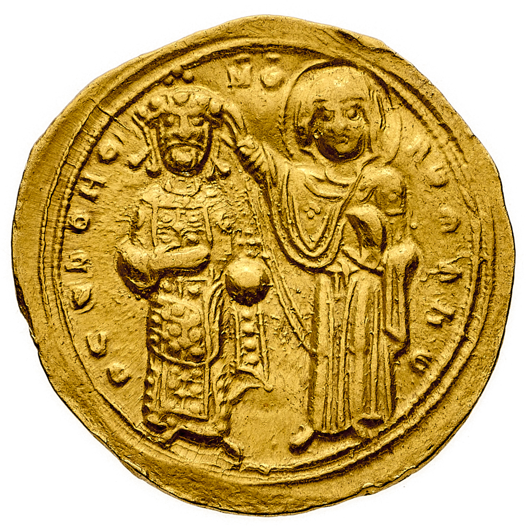 Romano III (1028-1034) - Histamenon - Zecca: Costantinopoli - Diritto: Gesù Cristo benedicente seduto di fronte - Rovescio: l'Imperatore stante di fronte con a fianco la Vergine nell'atto di incoronarlo con la mano destra - gr. 4,40 - q.SPL