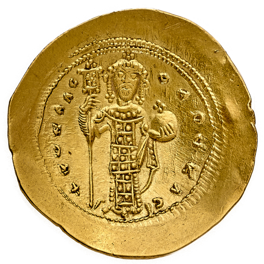 Costantino X (1059-1067) - Histamenon - Zecca: Costantinopoli - Diritto: Gesù Cristo benedicente seduto di fronte - Rovescio: l'Imperatore stante di fronte tiene un labarum con la mano destra e un globo crucigero con la sinistra - gr. 4,42 - Lievi colpetti e segni di contatto, altrimenti q.SPL