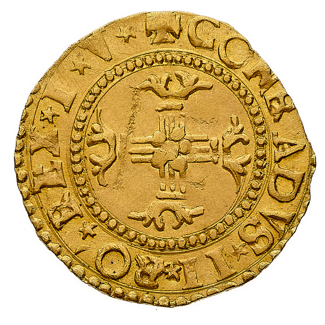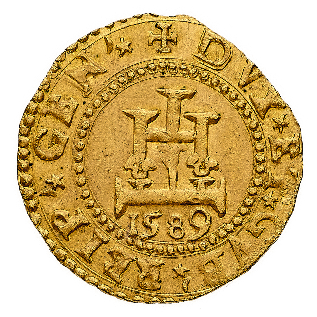 Governo dei Dogi Biennali (1528-1797) - Mezza Doppia 1589 - Diritto: castello con data sottostante - Rovescio: croce ornata - gr. 3,35 - Sigle IV - Molto rara - q.SPL