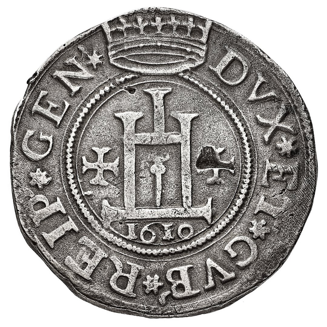 Governo dei Dogi Biennali (1528-1797) - Scudo Stretto 1610 - Diritto: castello sovrastato dalla corona e con due croci ai lati - Rovescio: croce patente accantonata da quattro stelle - gr. 38,31 - Sigle MC - Non comune - Difetto del metallo al diritto, altrimenti migliore di BB