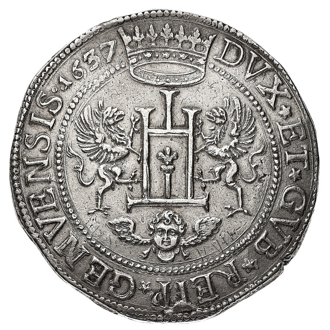 Governo dei Dogi Biennali (1528-1797) - Da 2 Scudi 1637 - Diritto: castello con cerchio sormontato da un anello e con due grifoni; sotto una testa alata - Rovescio: croce ornata accantonata da quattro teste alate - gr. 75,85 - Sigle IBSUS - Rara - q.SPL