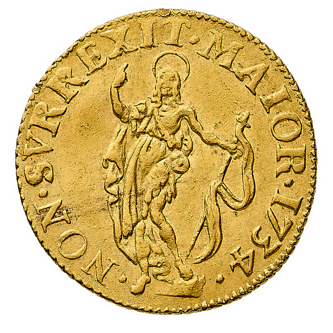 Governo dei Dogi Biennali (1528-1797) - Zecchino 1734 - Diritto: stemma in cartocci coronato - Rovescio: San Giovanni stante di fronte nell'atto di predicare - gr. 3,46 - Rara - SPL