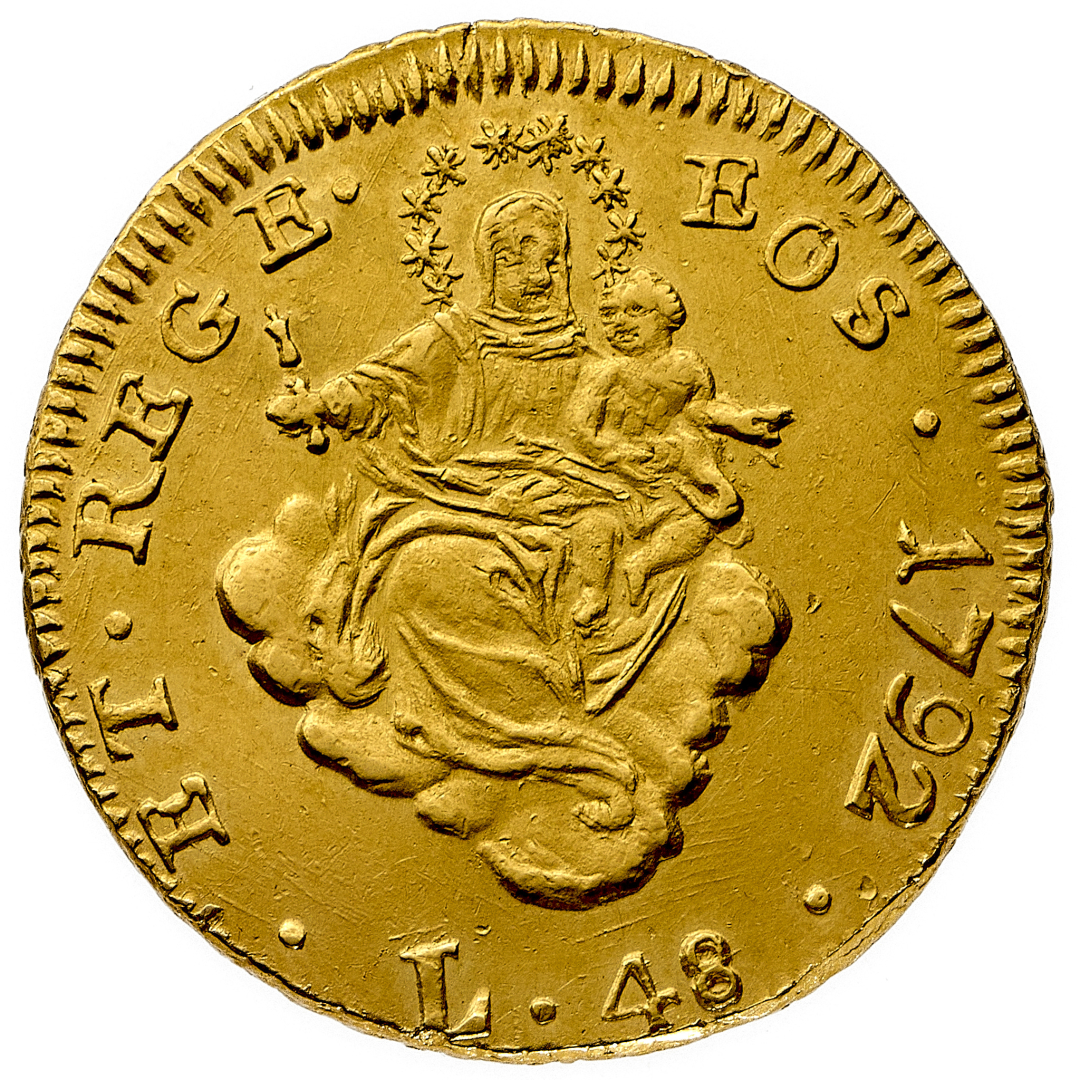 Governo dei Dogi Biennali (1528-1797) - 48 Lire 1792 - Diritto: due grifoni reggono lo stemma della Repubblica e la corona sovrastante - Rovescio: la Vergine con il bambino coronata di stelle e seduta sulle nubi - gr. 12,59 - Rara - Migliore di SPL