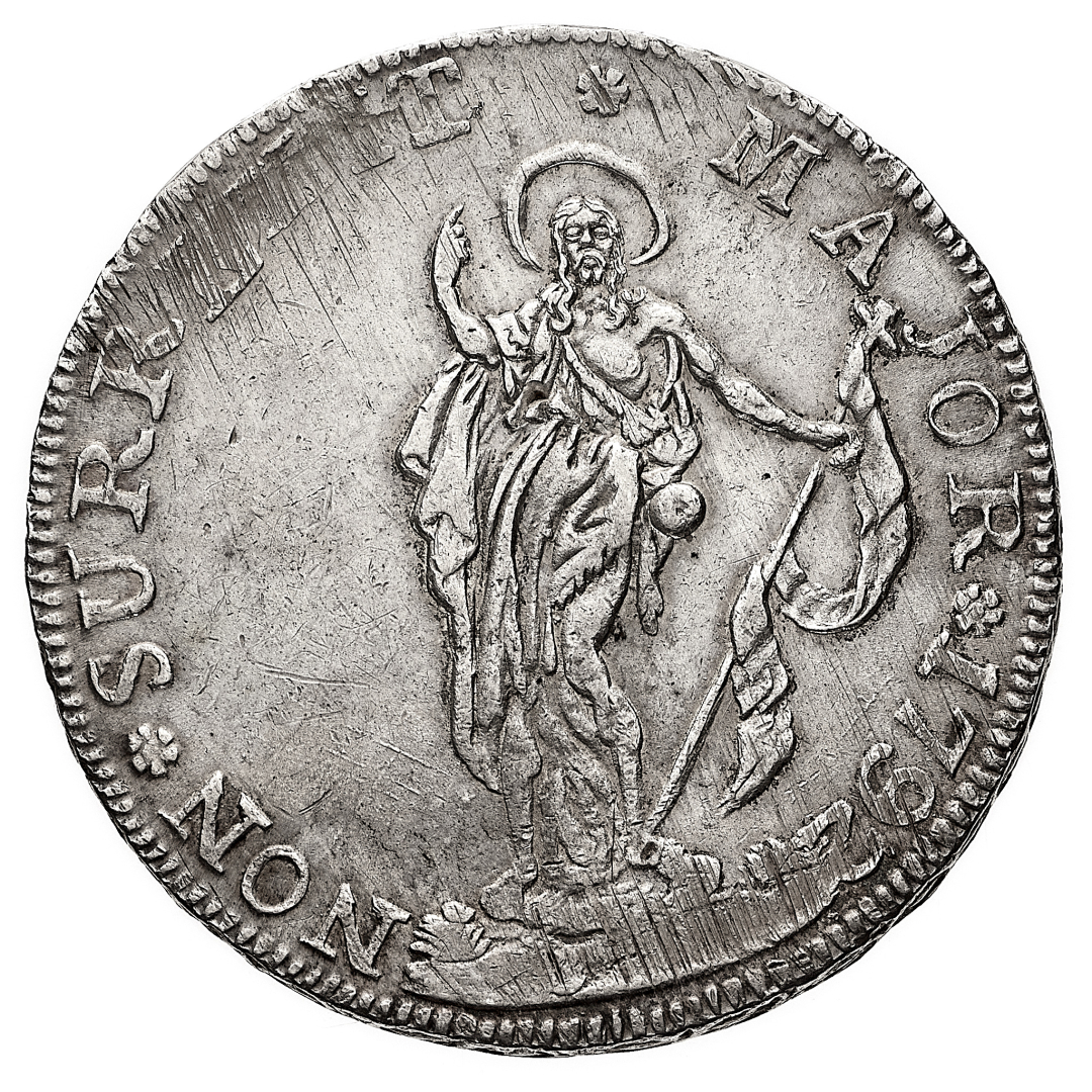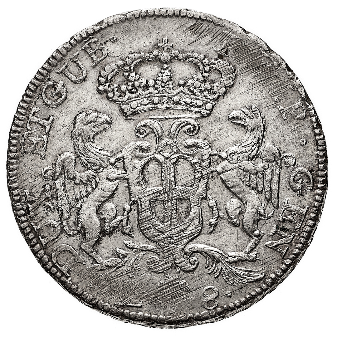 Governo dei Dogi Biennali (1528-1797) - 8 Lire 1792 - Diritto: due grifoni reggono lo stemma della Repubblica e la corona sovrastante - Rovescio: San Giovanni Battista nell'atto di benedire con la mano destra, regge un vessillo con la sinistra - gr. 33,25 - Non comune - Patina delicata, SPL