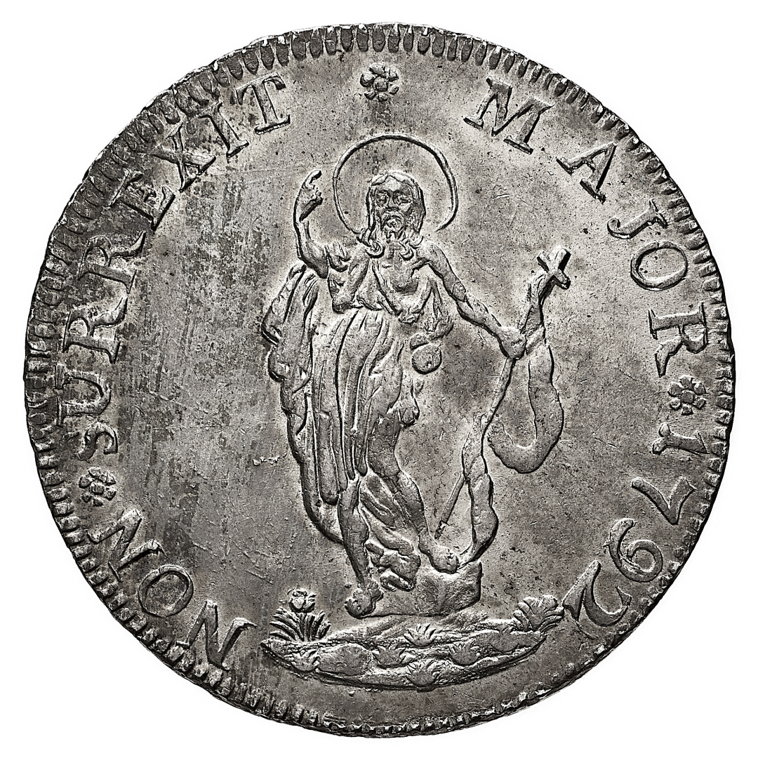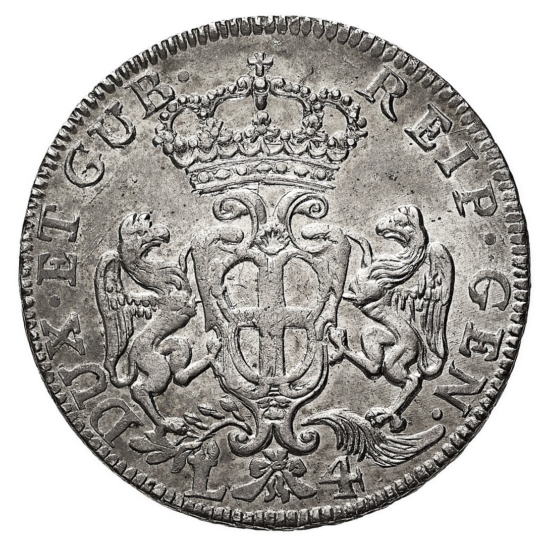 Governo dei Dogi Biennali (1528-1797) - 4 Lire 1792 - Diritto: due grifoni reggono lo stemma della Repubblica e la corona sovrastante - Rovescio: San Giovanni Battista nell'atto di benedire con la mano destra, regge un vessillo con la sinistra - gr. 16,62 - Non comune - Patina delicata, SPL