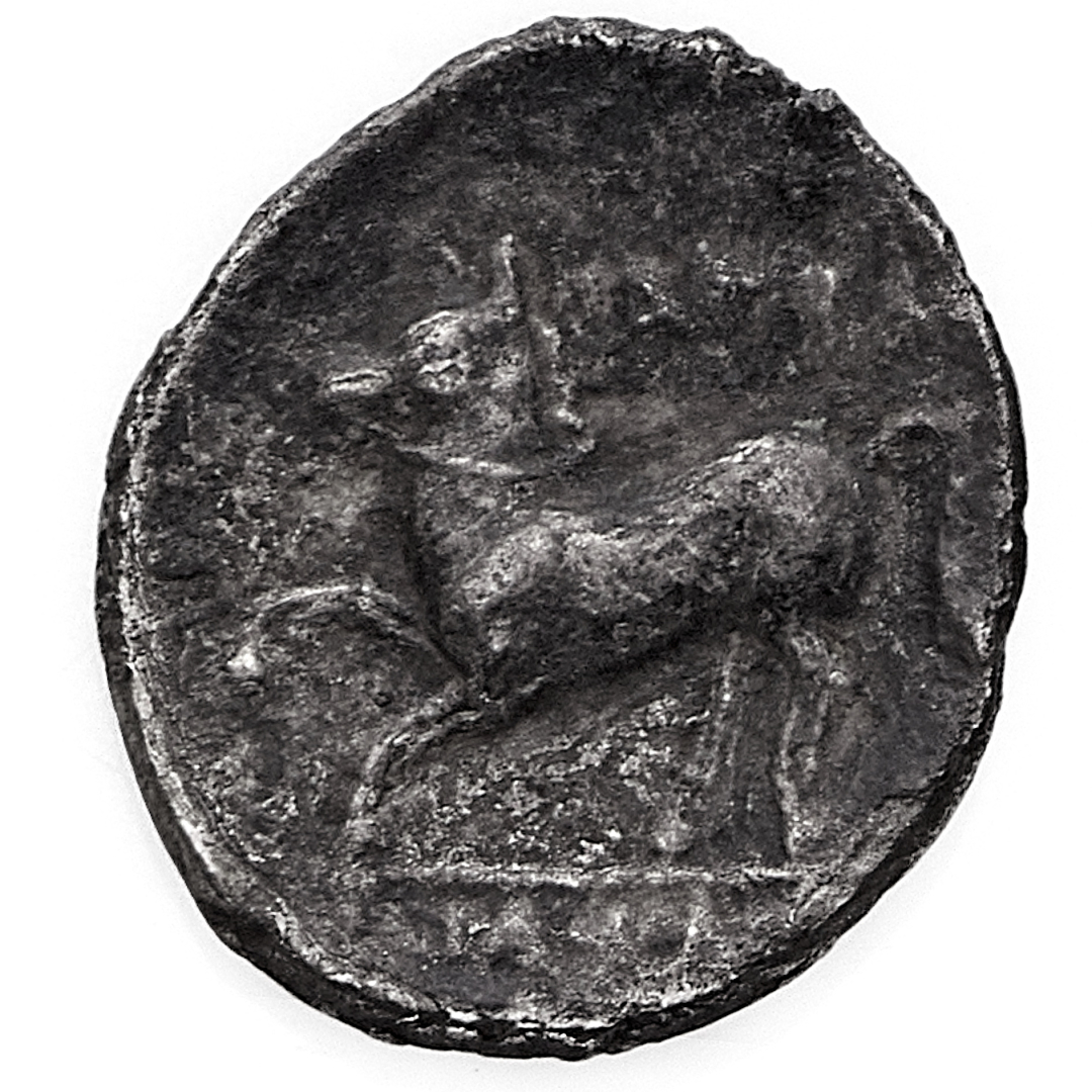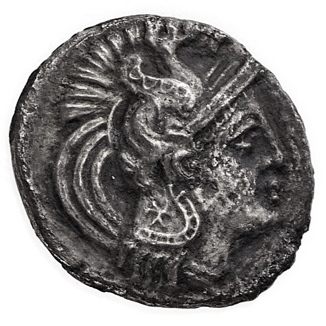 Arpi - Diobolo databile al periodo 325-275 a.C. - Diritto: testa di Atena a destra con elmo attico crestato e ornato da un ippocampo - Rovescio: cavallo al galoppo verso sinistra - gr. 0,94 - Rara - BB - Corredata da cartellino di provenienza