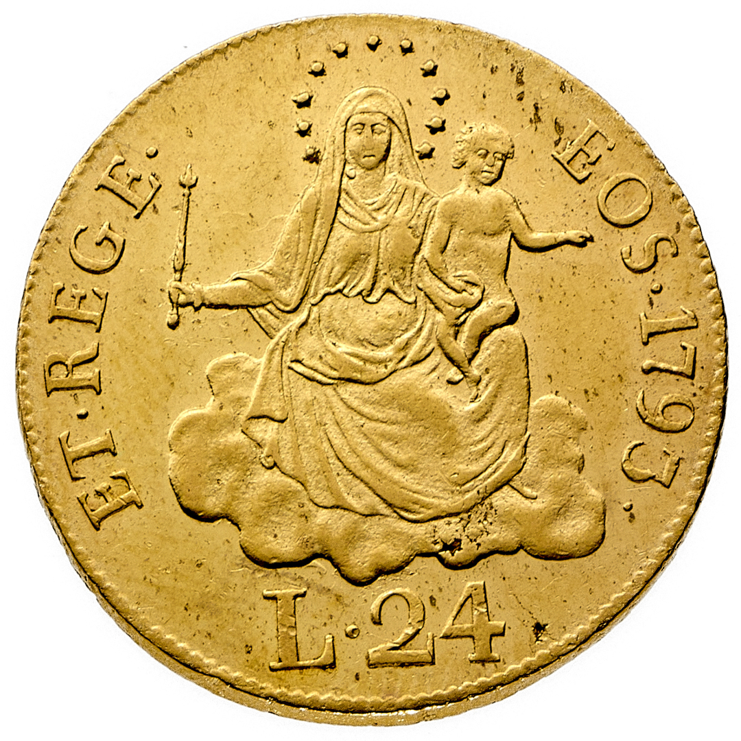 Governo dei Dogi Biennali (1528-1797) - 24 Lire 1793 NGC AU 58 - Diritto: due grifoni reggono lo stemma della Repubblica e la corona sovrastante - Rovescio: la Vergine con il Bambino - gr. 5,51 - Rara - Cert. #8585045-013