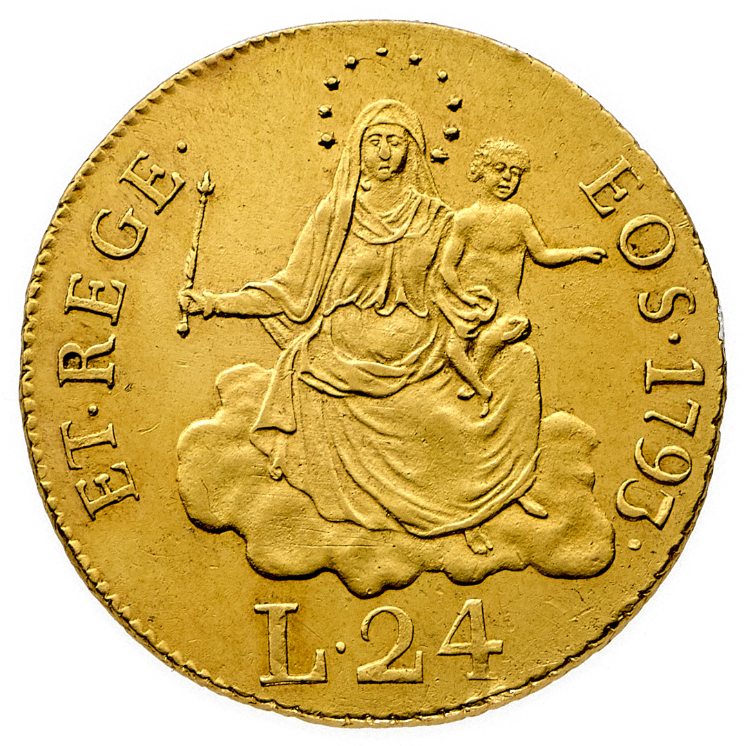 Governo dei Dogi Biennali (1528-1797) - 24 Lire 1793 - Diritto: due grifoni reggono lo stemma della Repubblica e la corona sovrastante - Rovescio: la Vergine con il Bambino - gr. 5,52 - Rara - SPL