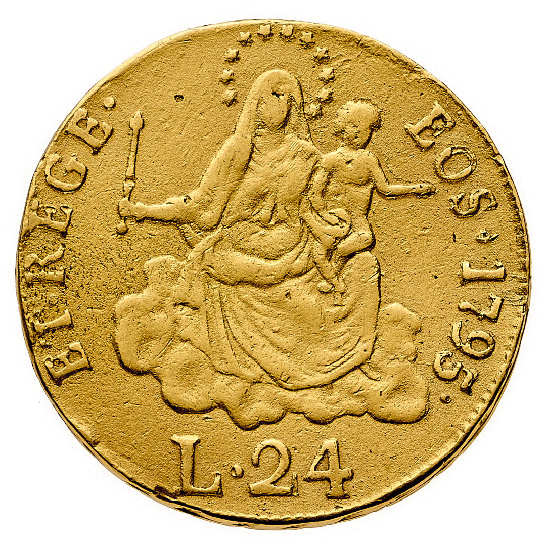 Governo dei Dogi Biennali (1528-1797) - 24 Lire 1795 - Zecca: Genova - Diritto: due grifoni reggono lo stemma della Repubblica e la corona sovrastante - Rovescio: la Vergine con il Bambino - gr. 5,47 - Rara - Lievi tracce di montatura, altrimenti migliore di BB