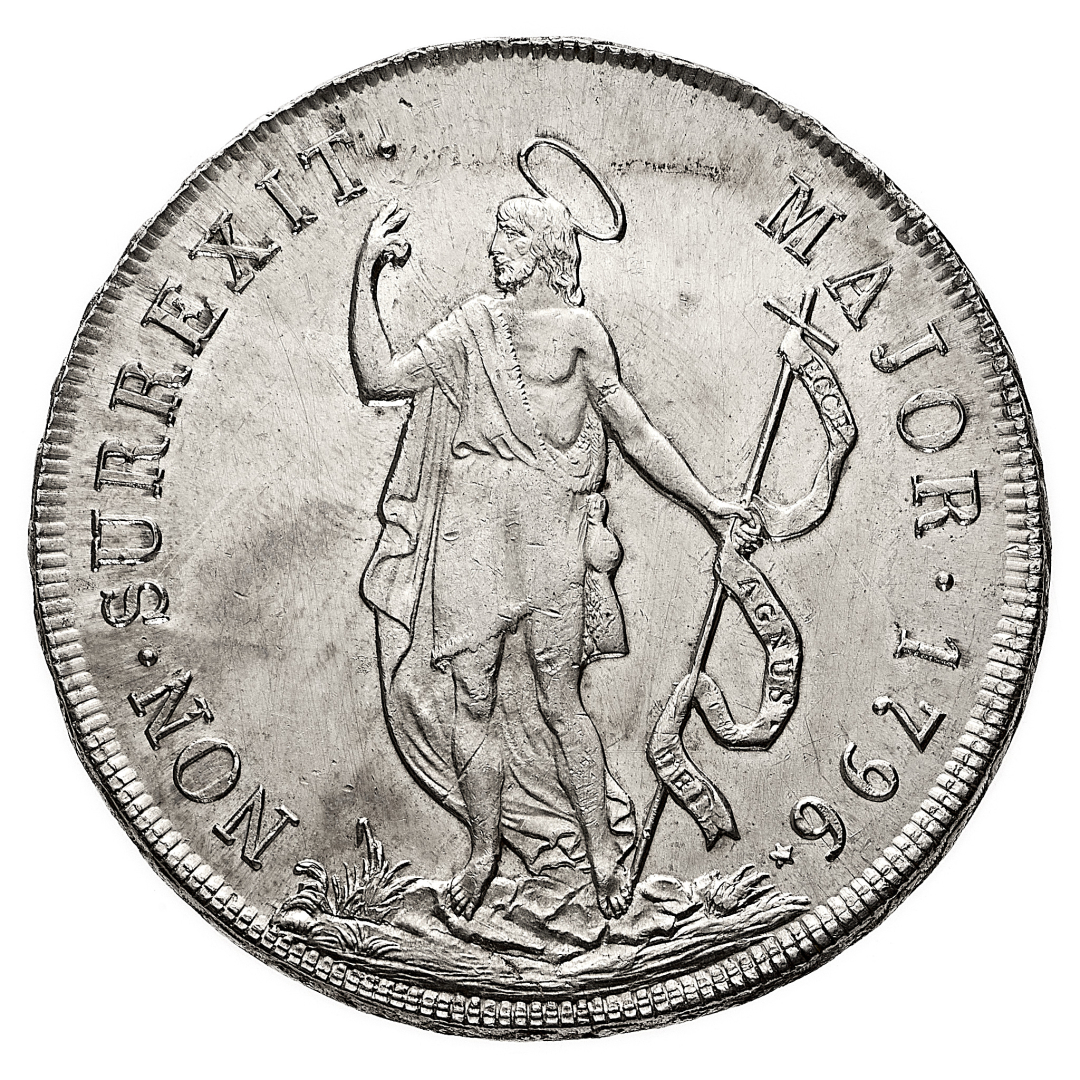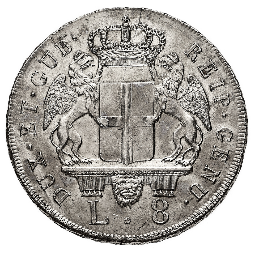 Governo dei Dogi Biennali (1528-1797) - 8 Lire 1796 - Diritto: due grifoni reggono lo stemma della Repubblica e la corona sovrastante - Rovescio: San Giovanni stante di fronte con il volto a sinistra nell'atto di predicare - gr. 33,35 - Fondi lucenti, q.FDC