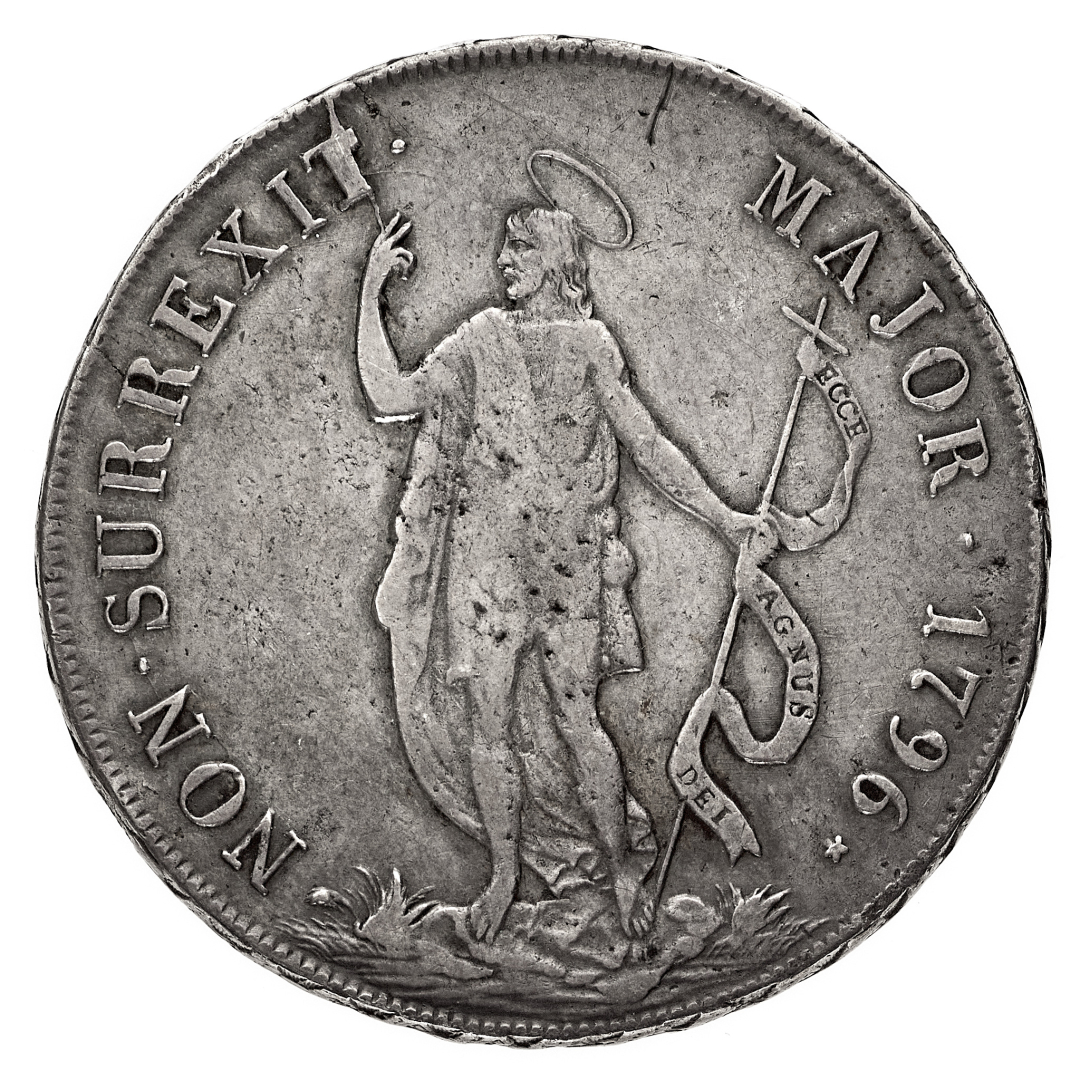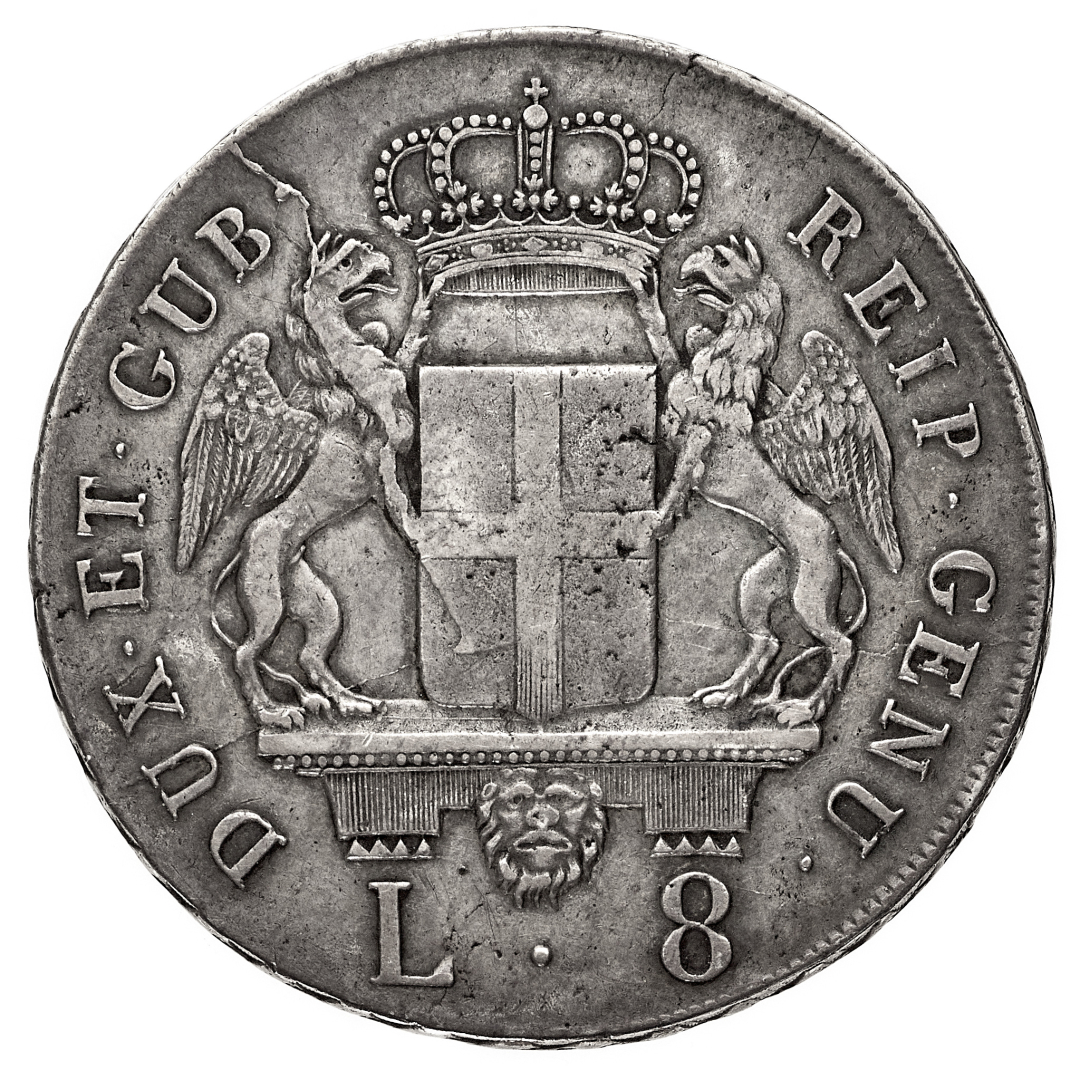 Governo dei Dogi Biennali (1528-1797) - 8 Lire 1796 - Diritto: due grifoni reggono lo stemma della Repubblica e la corona sovrastante - Rovescio: San Giovanni stante di fronte con il volto a sinistra nell'atto di predicare - gr. 32,88 - BB