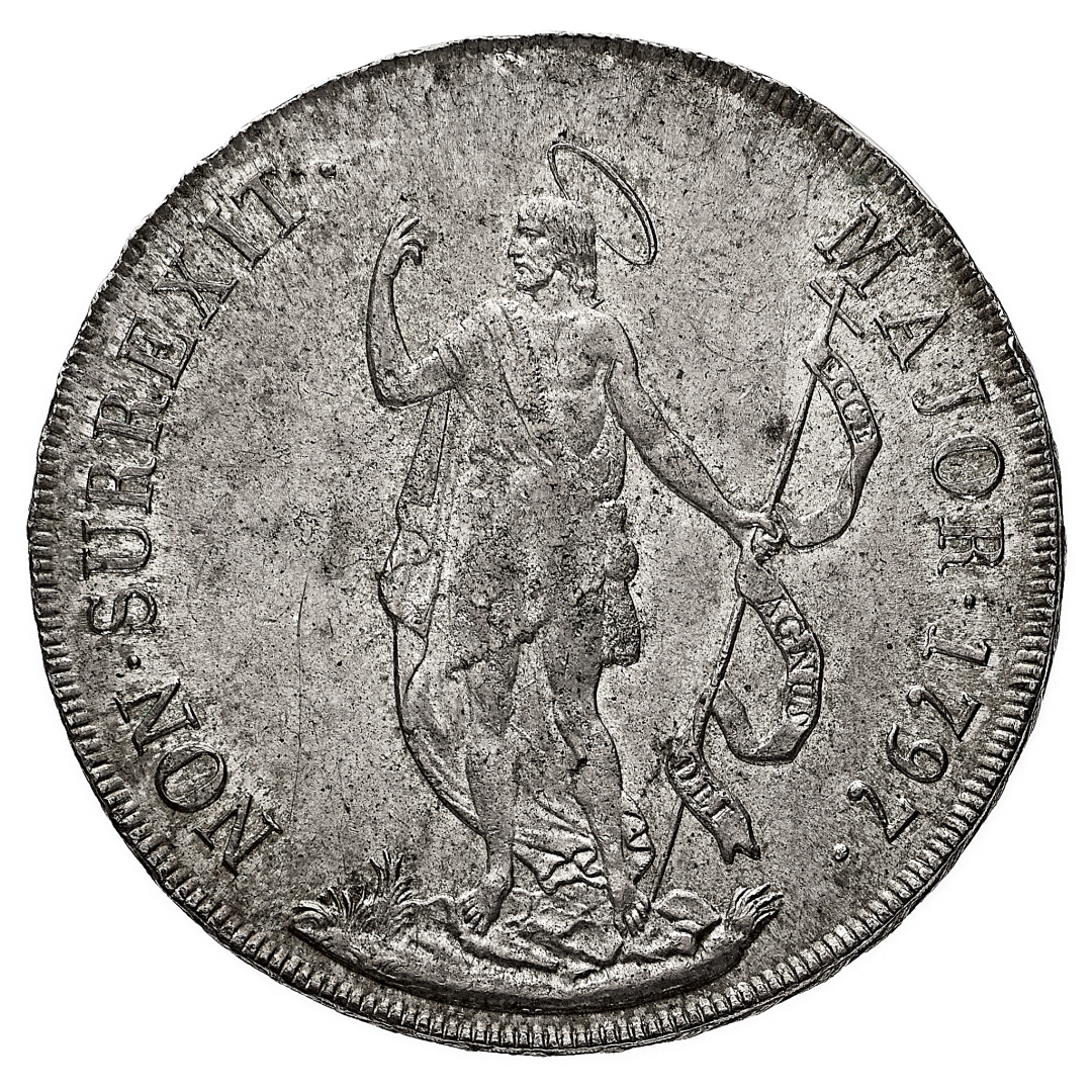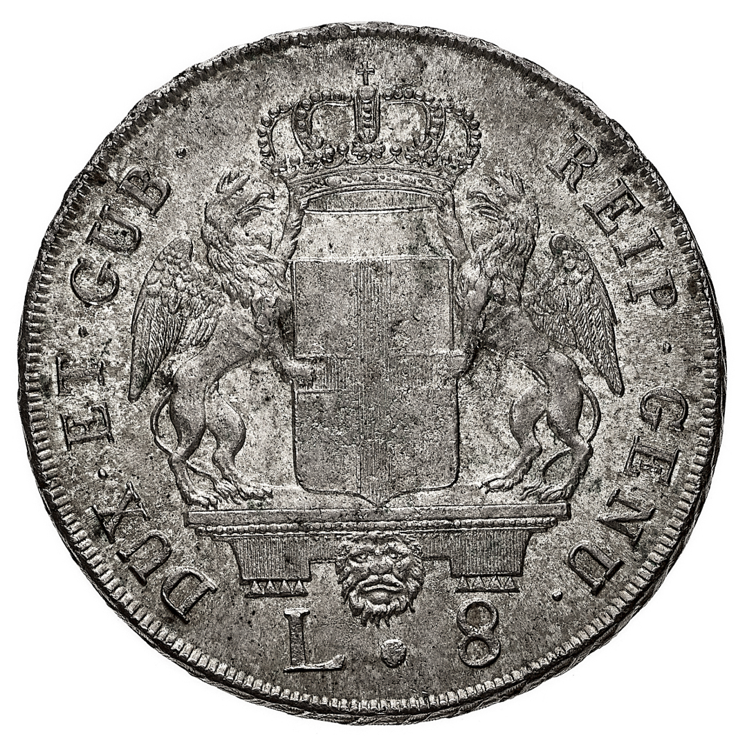 Governo dei Dogi Biennali (1528-1797) - 8 Lire 1797 - Diritto: due grifoni reggono lo stemma della Repubblica e la corona sovrastante - Rovescio: San Giovanni stante di fronte con il volto a sinistra nell'atto di predicare - gr. 33,09 - Fondi lucenti, q.FDC