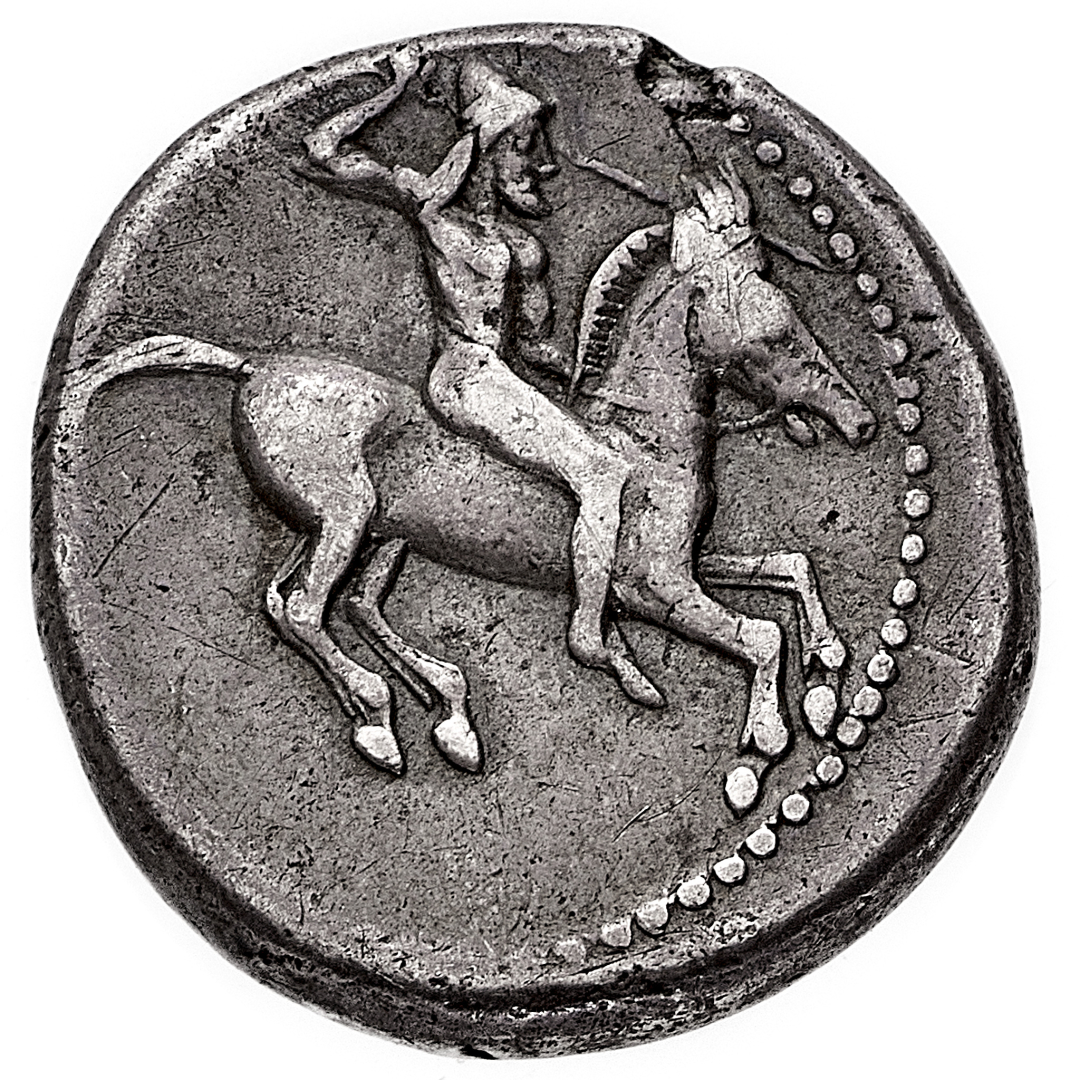 Gela - Didramma databile al periodo 490-475 a.C. - Diritto: guerriero al galoppo verso destra brandisce una lancia con il braccio destro - Rovescio: protome di toro androposopo a destra - gr. 8,60 - Lieve difetto del metallo al diritto, migliore di BB