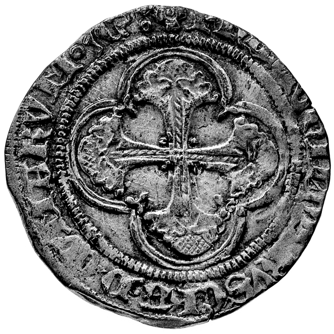Franchino II Rusca (1408-1412) - Grosso - Diritto: croce fiorata entro doppia cornice quadrilobata - Rovescio: San Abbondio seduto in trono benedicente - gr. 2,43 - Molto rara - BB