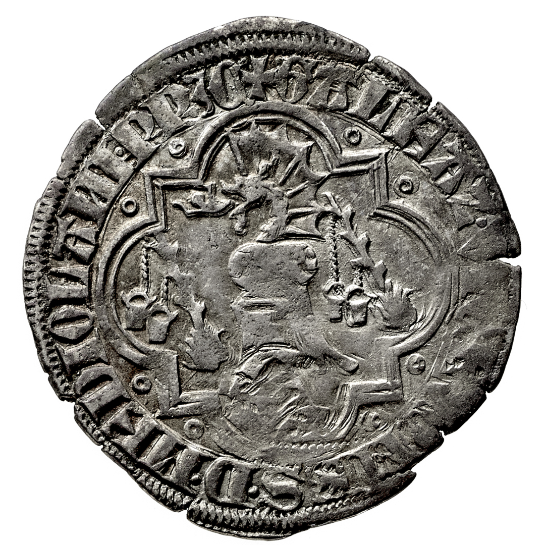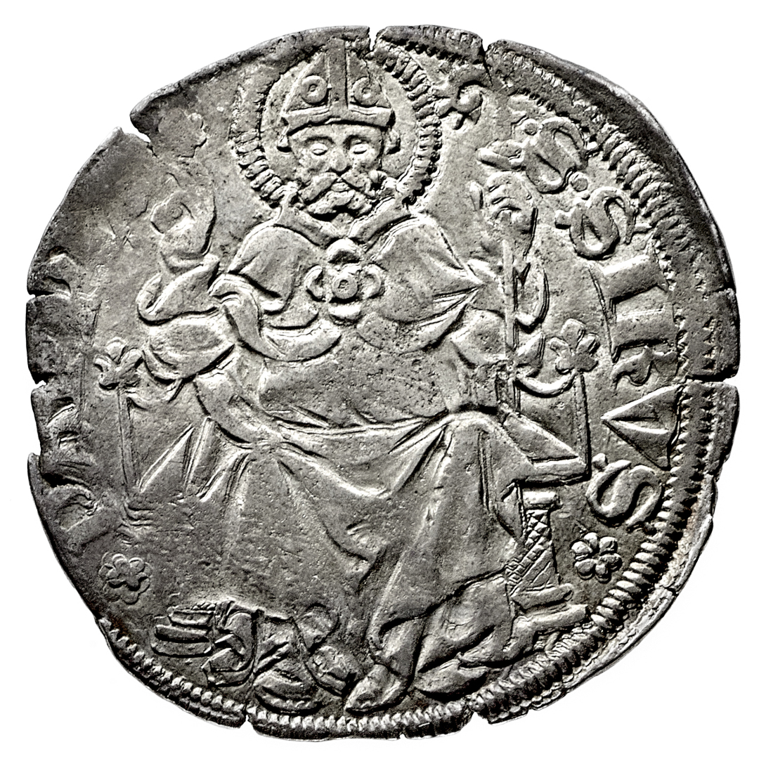 Galeazzo II Visconti (1359-1378) - Pegione o Grosso da 1 Soldo e mezzo - Diritto: biscione dei Visconti entro cornice - Rovescio: il Santo seduto di fronte - gr. 2,37 - Lieve frattura di conio, migliore di BB