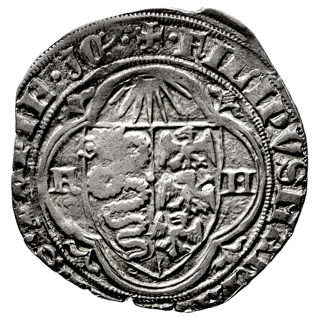Filippo Maria Visconti (1402-1412) - Grosso da un Soldo e mezzo - Diritto: stemma bipartito - Rovescio: Sant'Ambrogio, seduto in trono di fronte, tiene lo staffile con la mano destra e il pastorale con la sinistra - gr. 2,37 - Rara - Lievi ondulazioni del tondello e piccolo foro passante, migliore di BB