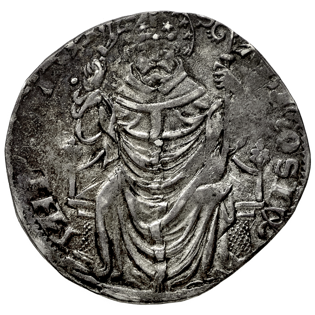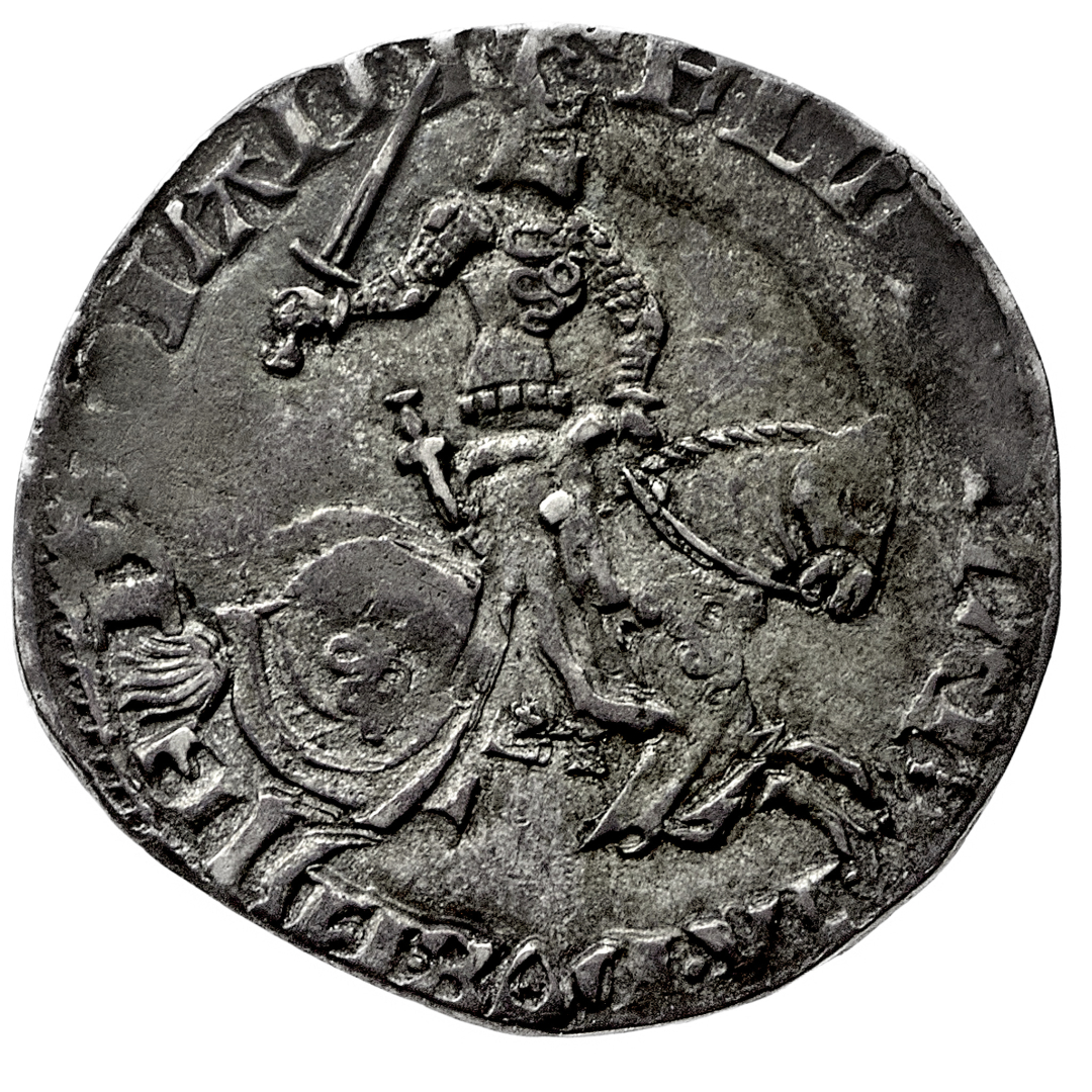 Filippo Maria Visconti (1412-1447) - Grosso o Berlinga - Diritto: il Duca a cavallo verso destra brandisce una spada con la mano destra - Rovescio: Sant'Ambrogio seduto di fronte tiene uno staffile con la mano destra e il pastorale con la sinistra - gr. 2,40 - Molto rara - BB