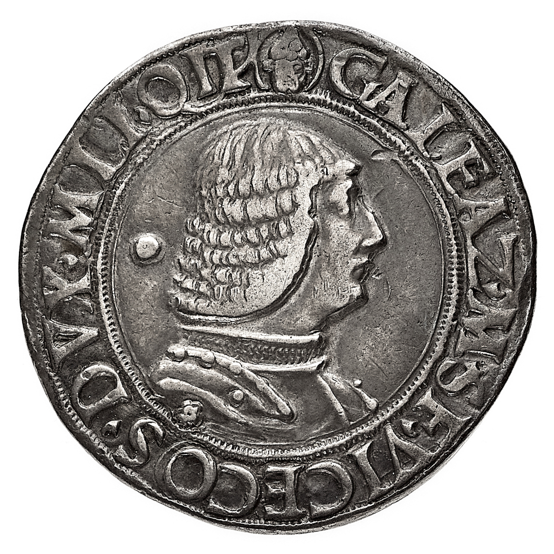 Galeazzo Maria Sforza (1466-1476) - Testone - Diritto: busto corazzato del Duca a destra - Rovescio: stemma sormontato da elmo con cimiero ornato dal drago crestato; ai lati tizzoni con le secchie e le iniziali - gr. 9,59 - q.SPL
