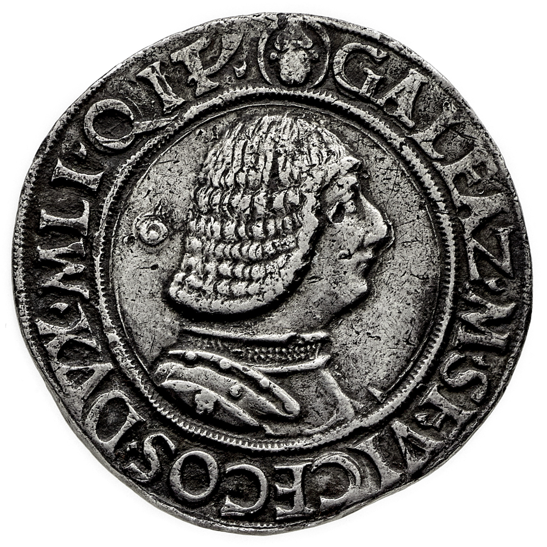 Galeazzo Maria Sforza (1466-1476) - Testone - Diritto: busto corazzato del Duca a destra - Rovescio: stemma sormontato da elmo con cimiero ornato dal drago crestato; ai lati tizzoni con le secchie e le iniziali - gr. 9,61 - Lievi corrosioni al rovescio, migliore di BB