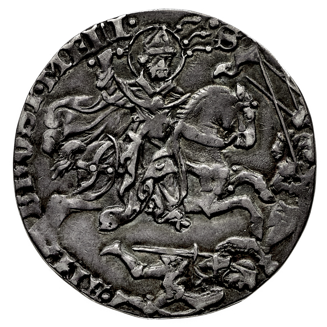 Galeazzo Maria Sforza (1466-1476) - Grosso da 8 Soldi - Diritto: busto corazzato del Duca a destra - Rovescio: Sant'Ambrogio a cavallo verso destra mette in fuga dei soldati; ai piedi del cavallo un nemico abbattuto - gr. 3,11 - Rara - Migliore di BB
