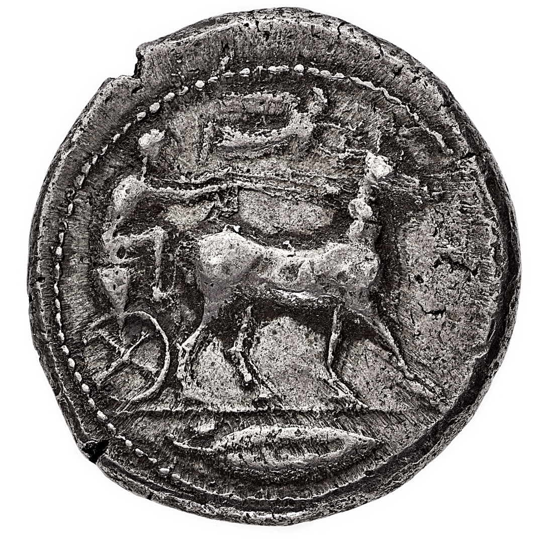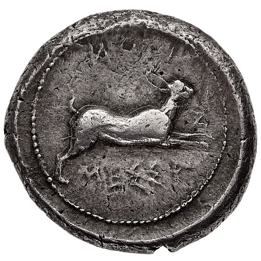 Messana (Zancle) - Tetradramma databile al periodo 438-434 a.C. - Diritto: biga trainata da mule, coronate dalla Vittoria, in lento movimento verso destra; in esergo una foglia di alloro - Rovescio: lepre in corsa verso destra - gr. 17,48 - Rara - BB