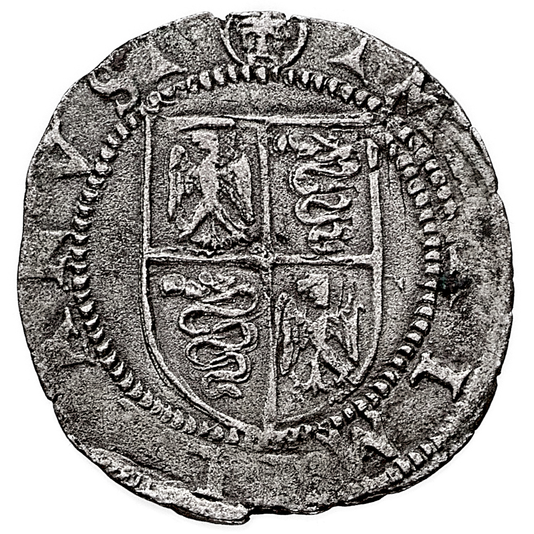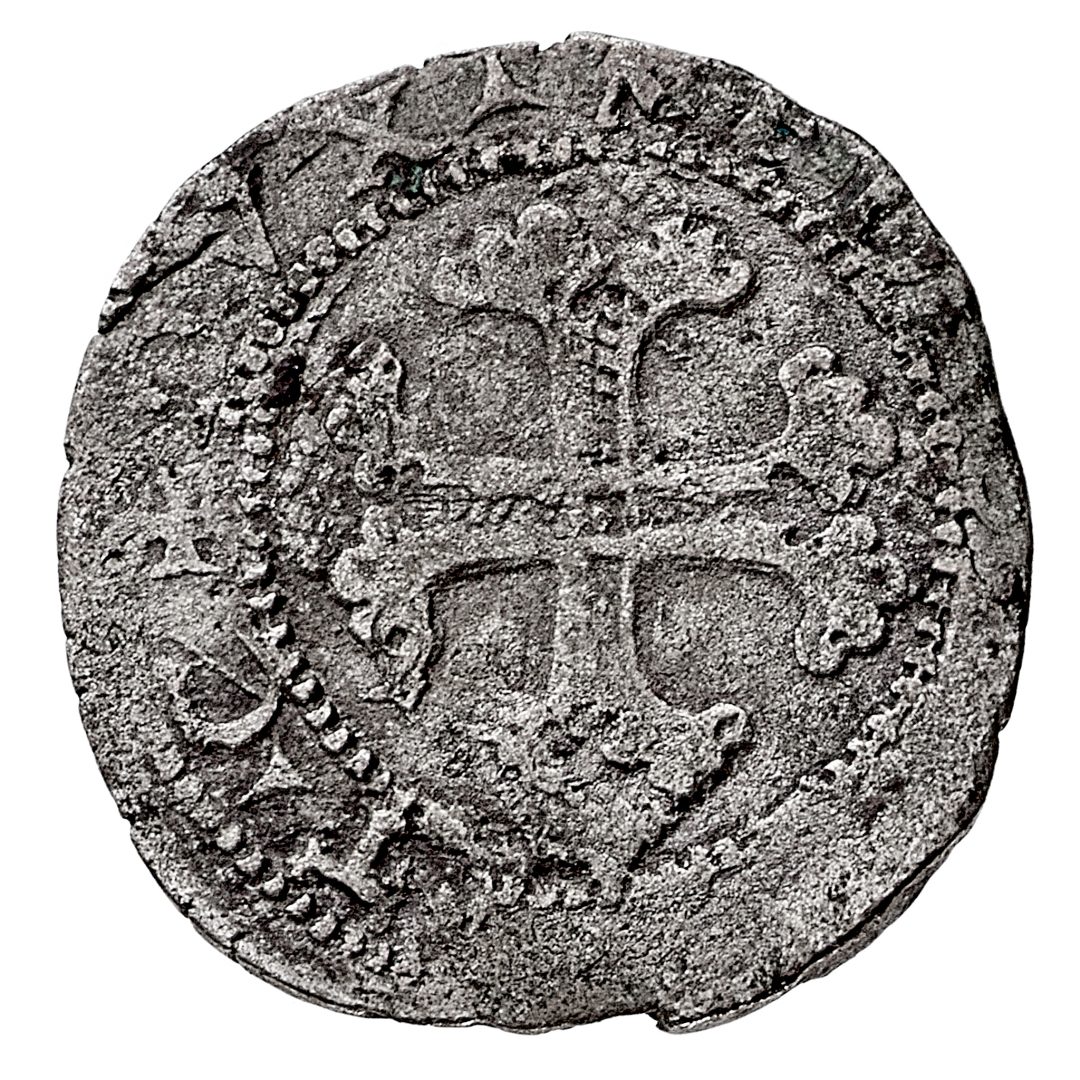 Massimiliano Sforza (1512-1515) - Sesino - Diritto: croce fogliata - Rovescio: stemma inquartato - gr. 0,97 - Rara - Lieve porosità del metallo, altrimenti migliore di BB - Corredata dal cartellino di Oscar Rinaldi