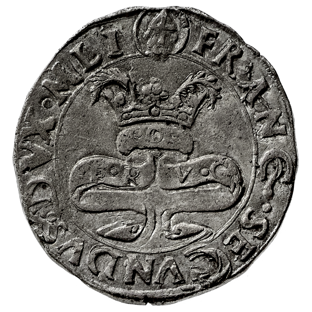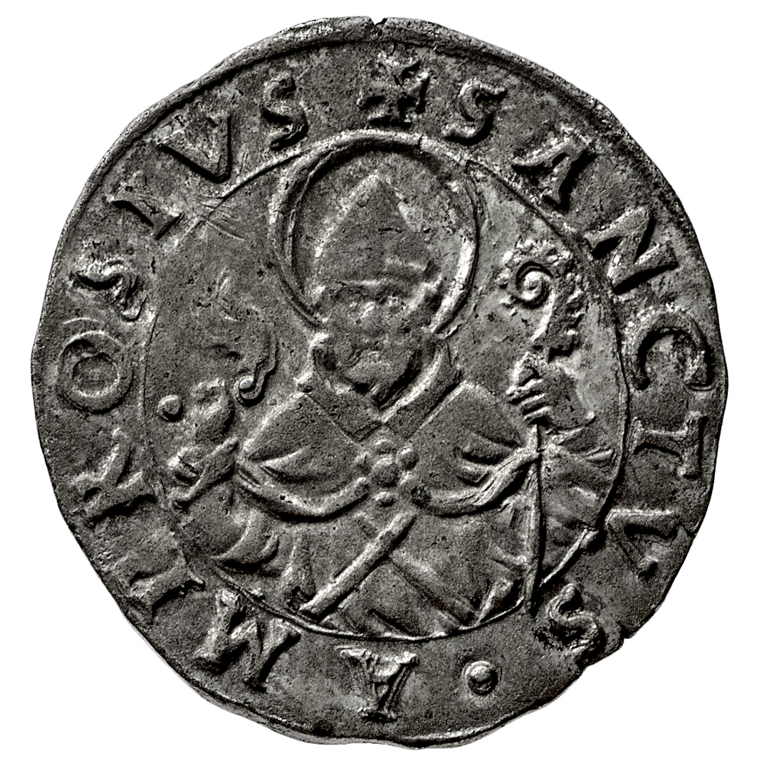 Francesco II Sforza (1521-1535) - Grosso da 3 Soldi - Diritto: corona dalla quale escono rami di palma e di ulivo - Rovescio: Sant'Ambrogio tiene uno staffile nella mano destra e un pastorale nella sinistra - gr. 2,59 - Migliore di BB