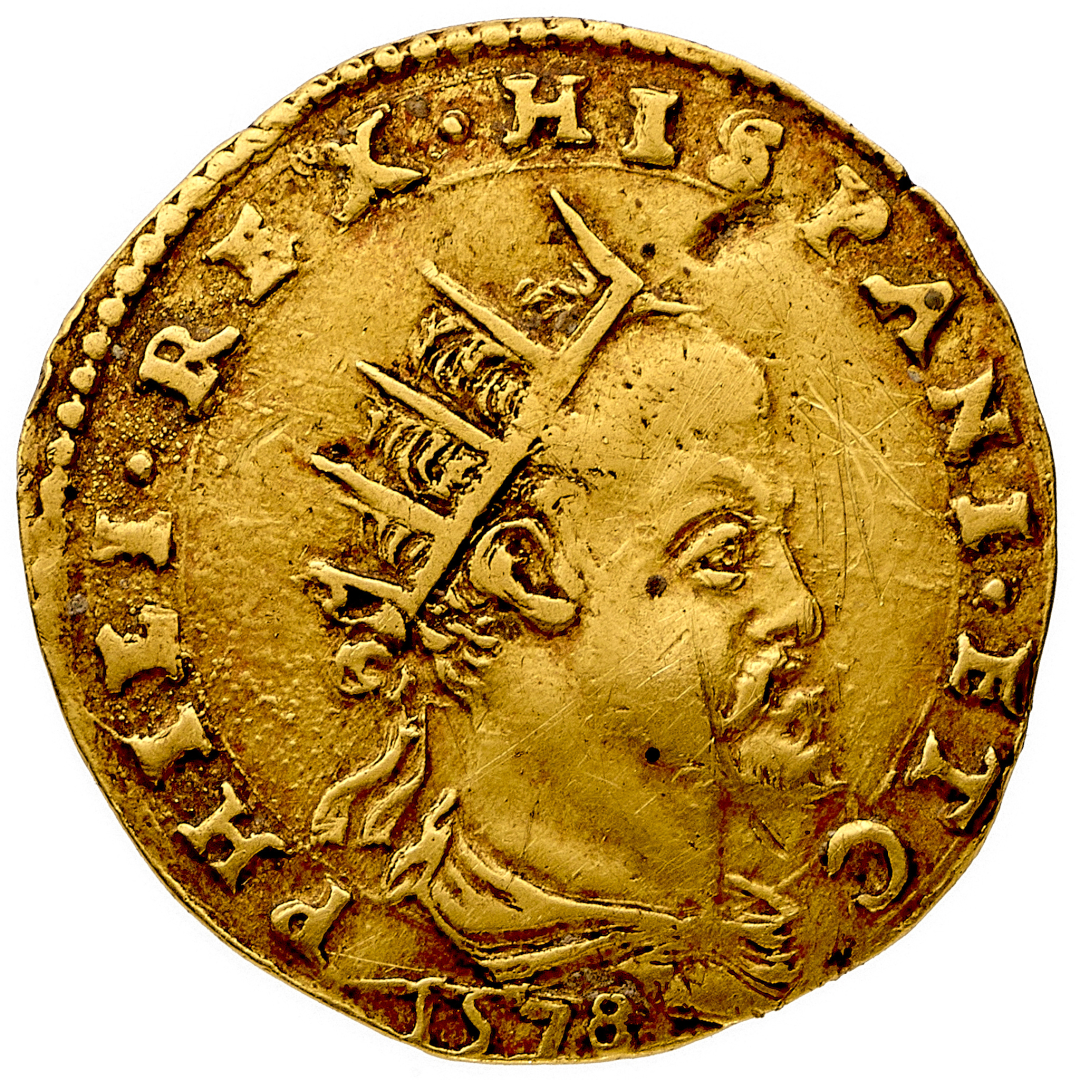 Filippo II di Spagna (1556-1598) - Doppia 1578 - Diritto: busto radiato, paludato e corazzato di Filippo II a destra - Rovescio: stemma sormontato dalla corona, dalla quale escono rami di palma e di alloro - gr. 6,58 - Rara - Lievi difetti al diritto, BB
